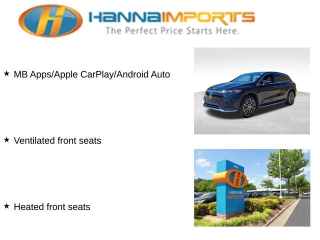 Why shop with Hanna Imports? We specialize in hand-selecting top-quality used cars, trucks, and SUVs for drivers across Raleigh, Durham, Cary, Chapel Hill, and the greater Triangle area of North Carolina. Our massive selection of 1,000+ vehicles on our Raleigh lot is carefully curated to include the most sought-after models, all priced below market value. We believe in transparency and efficiency—our vehicles are aggressively priced from the start, which means no haggling, no hassle, and no wasted time. The price you see is our absolute best price. Whether you're coming from Wake Forest, Apex, Garner, or anywhere in central NC, we’re committed to making your car-buying experience smooth, affordable, and enjoyable. Come see why Hanna Imports is one of the most trusted used car dealerships in North Carolina! Used Mercedes-Benz EQS in Raleigh. Used Mercedes-Benz EQS in North Carolina, Premium Trim Package, Exterior Parking Camera Rear, Heated front seats, MB Apps/Apple CarPlay/Android Auto, Navigation System, Power Liftgate, Power moonroof: Panorama, Remote keyless entry, Ventilated front seats, 15 Speakers, 4-Wheel Disc Brakes, ABS brakes, Adaptive suspension, Air Conditioning, Alloy wheels, Auto High-beam Headlights, Auto tilt-away steering wheel, Auto-dimming door mirrors, Auto-dimming Rear-View mirror, Auto-leveling suspension, Automatic temperature control, Axle Ratio: TBD, Brake assist, Bumpers: body-color, Compass, Delay-off headlights, Driver door bin, Driver vanity mirror, Dual front impact airbags, Dual front side impact airbags, Electronic Stability Control, Emergency communication system: eCall Emergency System, Four wheel independent suspension, Front anti-roll bar, Front Bucket Seats, Front Center Armrest, Front dual zone A/C, Front reading lights, Garage door transmitter: HomeLink, Genuine wood door panel insert, Head restraints memory, Heated & Ventilated Power Front Seats, Heated door mirrors, HVAC memory, Illuminated entry, Knee airbag, Leather steering wheel, Leather Upholstery, Low tire pressure warning, Memory seat, Occupant sensing airbag, Outside temperature display, Overhead airbag, Overhead console, Panic alarm, Passenger door bin, Passenger vanity mirror, Power adjustable front head restraints, Power door mirrors, Power driver seat, Power passenger seat, Power steering, Power windows, Premium audio system: MBUX, Radio data system, Radio: Burmester® 3D Surround Sound System, Rain sensing wipers, Rear anti-roll bar, Rear reading lights, Rear seat center armrest, Rear window defroster, Rear window wiper, Security system, Speed control, Speed-sensing steering, Speed-Sensitive Wipers, Split folding rear seat, Spoiler, Steering wheel memory, Steering wheel mounted audio controls, Telescoping steering wheel, Tilt steering wheel, Traction control, Trip computer, Turn signal indicator mirrors, Variably intermittent wipers, and Wheels: 20 x 8.5J 5-Spoke Aero w/Black Accents.