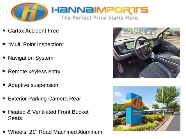Why shop with Hanna Imports? We specialize in hand-selecting top-quality used cars, trucks, and SUVs for drivers across Raleigh, Durham, Cary, Chapel Hill, and the greater Triangle area of North Carolina. Our massive selection of 1,000+ vehicles on our Raleigh lot is carefully curated to include the most sought-after models, all priced below market value. We believe in transparency and efficiency—our vehicles are aggressively priced from the start, which means no haggling, no hassle, and no wasted time. The price you see is our absolute best price. Whether you're coming from Wake Forest, Apex, Garner, or anywhere in central NC, we’re committed to making your car-buying experience smooth, affordable, and enjoyable. Come see why Hanna Imports is one of the most trusted used car dealerships in North Carolina! Used Rivian R1T in Raleigh. Used Rivian R1T in North Carolina, R1T Adventure, Electric ZEV 533hp, AWD, Adaptive suspension, Exterior Parking Camera Rear, Heated & Ventilated Front Bucket Seats, Navigation System, Remote keyless entry, Wheels: 21 Road Machined Aluminum, 17 Speakers, 4-Wheel Disc Brakes, ABS brakes, Air Conditioning, Alloy wheels, Audio memory, Auto High-beam Headlights, Auto tilt-away steering wheel, Auto-dimming door mirrors, Auto-dimming Rear-View mirror, Auto-leveling suspension, Automatic temperature control, Brake assist, Delay-off headlights, Driver door bin, Driver vanity mirror, Dual front impact airbags, Dual front side impact airbags, Electronic Stability Control, Emergency communication system, Four wheel independent suspension, Front anti-roll bar, Front Bucket Seats, Front Center Armrest, Front dual zone A/C, Front fog lights, Front reading lights, Fully automatic headlights, Heated door mirrors, Heated front seats, Heated steering wheel, Illuminated entry, Knee airbag, Low tire pressure warning, Memory seat, Occupant sensing airbag, Outside temperature display, Overhead airbag, Panic alarm, Passenger door bin, Passenger vanity mirror, Perf Vegan Leather Seat Trim w/Patterned Stitching, Power door mirrors, Power driver seat, Power passenger seat, Power steering, Power windows, Radio: New Rivian Elevation Audio, Rain sensing wipers, Rear air conditioning, Rear anti-roll bar, Rear audio controls, Rear dual zone A/C, Rear fog lights, Rear reading lights, Rear seat center armrest, Rear window defroster, Security system, Speed control, Speed-sensing steering, Split folding rear seat, Spoiler, Steering wheel memory, Steering wheel mounted audio controls, Telescoping steering wheel, Tilt steering wheel, Traction control, Trip computer, Turn signal indicator mirrors, Variably intermittent wipers, and Ventilated front seats.