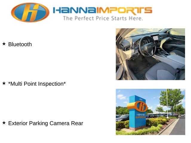 Why shop with Hanna Imports? We specialize in hand-selecting top-quality used cars, trucks, and SUVs for drivers across Raleigh, Durham, Cary, Chapel Hill, and the greater Triangle area of North Carolina. Our massive selection of 1,000+ vehicles on our Raleigh lot is carefully curated to include the most sought-after models, all priced below market value. We believe in transparency and efficiency—our vehicles are aggressively priced from the start, which means no haggling, no hassle, and no wasted time. The price you see is our absolute best price. Whether you're coming from Wake Forest, Apex, Garner, or anywhere in central NC, we’re committed to making your car-buying experience smooth, affordable, and enjoyable. Come see why Hanna Imports is one of the most trusted used car dealerships in North Carolina! Used Toyota Camry in Raleigh. Used Toyota Camry in North Carolina, Camry LE, Black w/Fabric Seat Trim, Exterior Parking Camera Rear, 4-Wheel Disc Brakes, 6 Speakers, 7.5J x 17 Alloy Wheels, ABS brakes, Air Conditioning, Alloy wheels, AM/FM radio: SiriusXM, Apple CarPlay/Android Auto, Auto High-beam Headlights, Automatic temperature control, Brake assist, Bumpers: body-color, Delay-off headlights, Driver door bin, Driver vanity mirror, Dual front impact airbags, Dual front side impact airbags, Electronic Stability Control, Emergency communication system: Safety Connect (1-year trial), Fabric Seat Trim, Four wheel independent suspension, Front anti-roll bar, Front Bucket Seats, Front Center Armrest, Front dual zone A/C, Front reading lights, Fully automatic headlights, Illuminated entry, Knee airbag, Low tire pressure warning, Occupant sensing airbag, Outside temperature display, Overhead airbag, Overhead console, Panic alarm, Passenger door bin, Passenger vanity mirror, Power door mirrors, Power driver seat, Power steering, Power windows, Radio data system, Radio: Audio, Rear anti-roll bar, Rear seat center armrest, Rear side impact airbag, Rear window defroster, Remote keyless entry, Security system, Speed control, Speed-sensing steering, Split folding rear seat, Steering wheel mounted audio controls, Tachometer, Telescoping steering wheel, Tilt steering wheel, Traction control, Trip computer, and Variably intermittent wipers.
