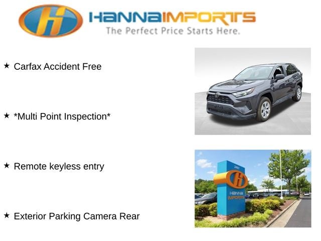 Why shop with Hanna Imports? We specialize in hand-selecting top-quality used cars, trucks, and SUVs for drivers across Raleigh, Durham, Cary, Chapel Hill, and the greater Triangle area of North Carolina. Our massive selection of 1,000+ vehicles on our Raleigh lot is carefully curated to include the most sought-after models, all priced below market value. We believe in transparency and efficiency—our vehicles are aggressively priced from the start, which means no haggling, no hassle, and no wasted time. The price you see is our absolute best price. Whether you're coming from Wake Forest, Apex, Garner, or anywhere in central NC, we’re committed to making your car-buying experience smooth, affordable, and enjoyable. Come see why Hanna Imports is one of the most trusted used car dealerships in North Carolina! Used Toyota RAV4 in Raleigh. Used Toyota RAV4 in North Carolina, RAV4 LE, AWD, Black w/Fabric Seat Trim, Exterior Parking Camera Rear, Remote keyless entry, 17 Steel Wheels, 4-Wheel Disc Brakes, 6 Speakers, ABS brakes, Air Conditioning, AM/FM radio: SiriusXM, Auto High-beam Headlights, Axle Ratio: 3.177, Brake assist, Bumpers: body-color, Driver door bin, Driver vanity mirror, Dual front impact airbags, Dual front side impact airbags, Electronic Stability Control, Emergency communication system: Safety Connect (10-year trial), Fabric Seat Trim, Four wheel independent suspension, Front anti-roll bar, Front Bucket Seats, Front Center Armrest, Front reading lights, Illuminated entry, Knee airbag, Low tire pressure warning, Occupant sensing airbag, Outside temperature display, Overhead airbag, Overhead console, Panic alarm, Passenger door bin, Passenger vanity mirror, Power door mirrors, Power steering, Power windows, Radio data system, Radio: AM/FM/XM Audio System, Rear anti-roll bar, Rear seat center armrest, Rear window defroster, Rear window wiper, Speed control, Speed-sensing steering, Split folding rear seat, Spoiler, Steering wheel mounted audio controls, Tachometer, Telescoping steering wheel, Tilt steering wheel, Traction control, and Trip computer.
