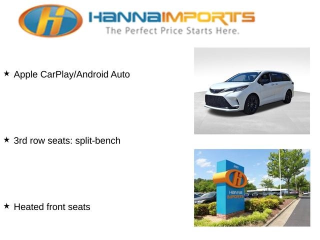 Why shop with Hanna Imports? We specialize in hand-selecting top-quality used cars, trucks, and SUVs for drivers across Raleigh, Durham, Cary, Chapel Hill, and the greater Triangle area of North Carolina. Our massive selection of 1,000+ vehicles on our Raleigh lot is carefully curated to include the most sought-after models, all priced below market value. We believe in transparency and efficiency—our vehicles are aggressively priced from the start, which means no haggling, no hassle, and no wasted time. The price you see is our absolute best price. Whether you're coming from Wake Forest, Apex, Garner, or anywhere in central NC, we’re committed to making your car-buying experience smooth, affordable, and enjoyable. Come see why Hanna Imports is one of the most trusted used car dealerships in North Carolina! Used Toyota Sienna in Raleigh. Used Toyota Sienna in North Carolina, Sienna XSE 7 Passenger, 3rd row seats: split-bench, Apple CarPlay/Android Auto, Exterior Parking Camera Rear, Heated front seats, Lane Departure Warning System, Navigation System, Power Liftgate, Power moonroof, Remote keyless entry, 4-Wheel Disc Brakes, ABS brakes, Air Conditioning, Alloy wheels, AM/FM radio: SiriusXM, Auto High-beam Headlights, Auto-dimming door mirrors, Auto-dimming Rear-View mirror, Automatic temperature control, Axle Ratio: TBA, Brake assist, Bumpers: body-color, Compass, Delay-off headlights, Driver door bin, Driver vanity mirror, Driver's Seat Mounted Armrest, Dual front impact airbags, Dual front side impact airbags, Electronic Stability Control, Emergency communication system: Safety Connect (3-year trial), Four wheel independent suspension, Front anti-roll bar, Front Bucket Seats, Front dual zone A/C, Front fog lights, Front reading lights, Fully automatic headlights, Garage door transmitter: HomeLink, Heated door mirrors, Illuminated entry, Knee airbag, Leather Shift Knob, Leather steering wheel, Low tire pressure warning, Occupant sensing airbag, Outside temperature display, Overhead airbag, Overhead console, Panic alarm, Passenger door bin, Passenger seat mounted armrest, Passenger vanity mirror, Power door mirrors, Power driver seat, Power passenger seat, Power steering, Power windows, Radio data system, Radio: Premium JBL Audio w/Navigation, Rear air conditioning, Rear anti-roll bar, Rear dual zone A/C, Rear reading lights, Rear side impact airbag, Rear window defroster, Rear window wiper, Reclining 3rd row seat, Speed control, Speed-sensing steering, Split folding rear seat, Spoiler, Steering wheel mounted audio controls, Tachometer, Telescoping steering wheel, Tilt steering wheel, Traction control, Trip computer, Turn signal indicator mirrors, Variably intermittent wipers, and Wheels: 20 Dark Alloy.