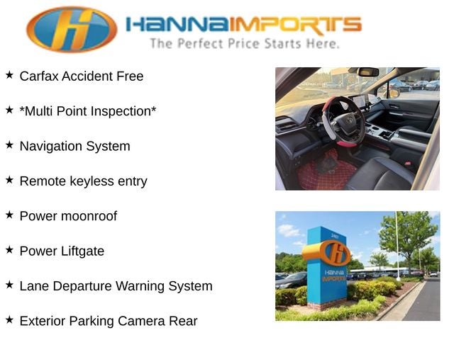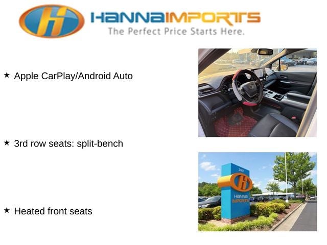 Why shop with Hanna Imports? We specialize in hand-selecting top-quality used cars, trucks, and SUVs for drivers across Raleigh, Durham, Cary, Chapel Hill, and the greater Triangle area of North Carolina. Our massive selection of 1,000+ vehicles on our Raleigh lot is carefully curated to include the most sought-after models, all priced below market value. We believe in transparency and efficiency—our vehicles are aggressively priced from the start, which means no haggling, no hassle, and no wasted time. The price you see is our absolute best price. Whether you're coming from Wake Forest, Apex, Garner, or anywhere in central NC, we’re committed to making your car-buying experience smooth, affordable, and enjoyable. Come see why Hanna Imports is one of the most trusted used car dealerships in North Carolina! Used Toyota Sienna in Raleigh. Used Toyota Sienna in North Carolina, Sienna XSE, 3rd row seats: split-bench, Apple CarPlay/Android Auto, Exterior Parking Camera Rear, Heated front seats, Lane Departure Warning System, Navigation System, Power Liftgate, Power moonroof, Remote keyless entry, 4-Wheel Disc Brakes, ABS brakes, Air Conditioning, Alloy wheels, AM/FM radio: SiriusXM, Auto High-beam Headlights, Auto-dimming door mirrors, Auto-dimming Rear-View mirror, Automatic temperature control, Axle Ratio: TBA, Brake assist, Bumpers: body-color, Compass, Delay-off headlights, Driver door bin, Driver vanity mirror, Driver's Seat Mounted Armrest, Dual front impact airbags, Dual front side impact airbags, Electronic Stability Control, Emergency communication system: Safety Connect (3-year trial), Four wheel independent suspension, Front anti-roll bar, Front Bucket Seats, Front dual zone A/C, Front fog lights, Front reading lights, Fully automatic headlights, Garage door transmitter: HomeLink, Heated door mirrors, Illuminated entry, Knee airbag, Leather Shift Knob, Leather steering wheel, Low tire pressure warning, Occupant sensing airbag, Outside temperature display, Overhead airbag, Overhead console, Panic alarm, Passenger door bin, Passenger seat mounted armrest, Passenger vanity mirror, Power door mirrors, Power driver seat, Power passenger seat, Power steering, Power windows, Radio data system, Radio: Premium JBL Audio w/Navigation, Rear air conditioning, Rear anti-roll bar, Rear dual zone A/C, Rear reading lights, Rear side impact airbag, Rear window defroster, Rear window wiper, Reclining 3rd row seat, Speed control, Speed-sensing steering, Split folding rear seat, Spoiler, Steering wheel mounted audio controls, Tachometer, Telescoping steering wheel, Tilt steering wheel, Traction control, Trip computer, Turn signal indicator mirrors, Variably intermittent wipers, and Wheels: 20 Dark Alloy.
