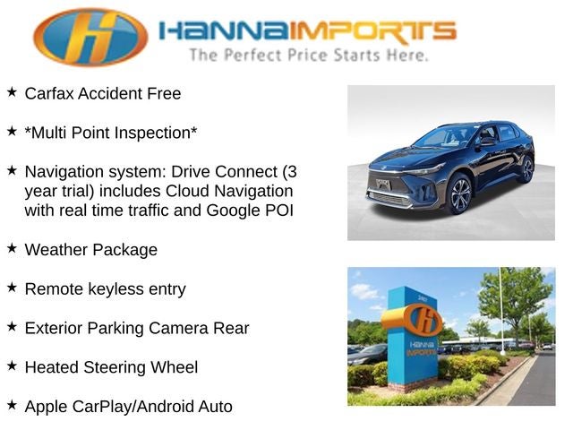 Why shop with Hanna Imports? We specialize in hand-selecting top-quality used cars, trucks, and SUVs for drivers across Raleigh, Durham, Cary, Chapel Hill, and the greater Triangle area of North Carolina. Our massive selection of 1,000+ vehicles on our Raleigh lot is carefully curated to include the most sought-after models, all priced below market value. We believe in transparency and efficiency—our vehicles are aggressively priced from the start, which means no haggling, no hassle, and no wasted time. The price you see is our absolute best price. Whether you're coming from Wake Forest, Apex, Garner, or anywhere in central NC, we’re committed to making your car-buying experience smooth, affordable, and enjoyable. Come see why Hanna Imports is one of the most trusted used car dealerships in North Carolina! Used Toyota bZ4X in Raleigh. Used Toyota bZ4X in North Carolina, Weather Package (Heated Front Seats and Heated Steering Wheel), bZ4X XLE, AWD, Apple CarPlay/Android Auto, Exterior Parking Camera Rear, Navigation system: Drive Connect (3 year trial) includes Cloud Navigation with real time traffic and Google POI, Remote keyless entry, 4-Wheel Disc Brakes, 6 Speakers, 6-Way Adjustable Front Seats, ABS brakes, Air Conditioning, Alloy wheels, AM/FM radio: SiriusXM, Auto High-beam Headlights, Auto-dimming Rear-View mirror, Automatic temperature control, Axle Ratio TBD, Brake assist, Bumpers: body-color, Delay-off headlights, Driver door bin, Driver vanity mirror, Dual front impact airbags, Dual front side impact airbags, Electronic Stability Control, Emergency communication system: Safety Connect (10-year trial), Fabric & SofTex Seat Trim, Four wheel independent suspension, Front anti-roll bar, Front Bucket Seats, Front Center Armrest, Front dual zone A/C, Front reading lights, Fully automatic headlights, Heated door mirrors, Illuminated entry, Knee airbag, Leather steering wheel, Low tire pressure warning, Occupant sensing airbag, Outside temperature display, Overhead airbag, Overhead console, Panic alarm, Passenger door bin, Passenger vanity mirror, Power door mirrors, Power steering, Power windows, Radio data system, Radio: 12.3 Toyota Audio Multimedia w/6 Speakers, Rain sensing wipers, Rear anti-roll bar, Rear seat center armrest, Rear window defroster, Security system, Speed control, Speed-sensing steering, Split folding rear seat, Spoiler, Steering wheel mounted audio controls, Telescoping steering wheel, Tilt steering wheel, Traction control, Trip computer, Turn signal indicator mirrors, Variably intermittent wipers, and Wheels: 18 Alloy w/Two-Tone Covers.