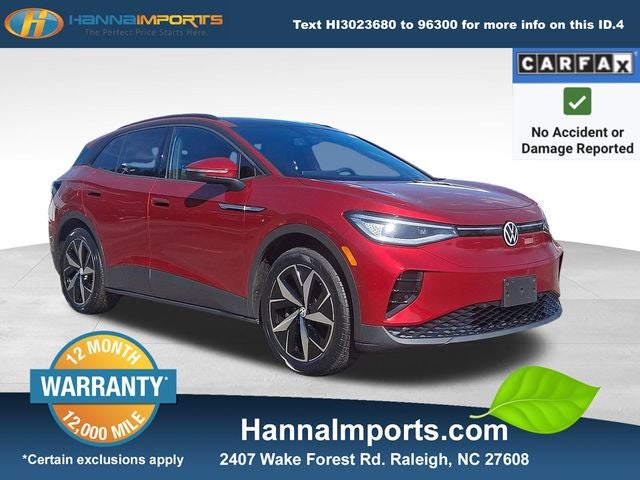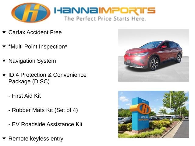 Why shop with Hanna Imports? We specialize in hand-selecting top-quality used cars, trucks, and SUVs for drivers across Raleigh, Durham, Cary, Chapel Hill, and the greater Triangle area of North Carolina. Our massive selection of 1,000+ vehicles on our Raleigh lot is carefully curated to include the most sought-after models, all priced below market value. We believe in transparency and efficiency—our vehicles are aggressively priced from the start, which means no haggling, no hassle, and no wasted time. The price you see is our absolute best price. Whether you're coming from Wake Forest, Apex, Garner, or anywhere in central NC, we’re committed to making your car-buying experience smooth, affordable, and enjoyable. Come see why Hanna Imports is one of the most trusted used car dealerships in North Carolina! Used Volkswagen ID.4 in Raleigh. Used Volkswagen ID.4 in North Carolina, ID.4 Protection & Convenience Package (DISC) (EV Roadside Assistance Kit, First Aid Kit, Rubber Mats Kit (Set of 4), and Heavy Duty Trunk Liner w/VW CarGo Blocks), ID.4 S, Exterior Parking Camera Rear, Navigation System, Power Liftgate, Remote keyless entry, 4 Wheel Independent Suspension, 4.39 Axle Ratio, 7 Speakers, ABS brakes, Air Conditioning, Alloy wheels, Auto High-beam Headlights, Auto-dimming Rear-View mirror, Auto-Dimming Rearview Mirror w/HomeLink Connect, Automatic temperature control, Brake assist, Bumpers: body-color, Delay-off headlights, Driver door bin, Driver vanity mirror, Driver's Seat Mounted Armrest, Dual front impact airbags, Dual front side impact airbags, Electronic Stability Control, Emergency communication system: VW Car-Net Safe & Secure 5-year, Four wheel independent suspension, Front anti-roll bar, Front Bucket Seats, Front dual zone A/C, Front fog lights, Front reading lights, Fully automatic headlights, Heated door mirrors, Heated Front Seats, Heated front seats, Heated steering wheel, Illuminated entry, Low tire pressure warning, Memory seat, Occupant sensing airbag, Outside temperature display, Overhead airbag, Overhead console, Panic alarm, Passenger door bin, Passenger seat mounted armrest, Passenger vanity mirror, Perforated V-Tex Leatherette Seating Surfaces, Power door mirrors, Power driver seat, Power passenger seat, Power steering, Power windows, Radio data system, Radio: Discover Pro Max w/12 Touchscreen Nav, Rain sensing wipers, Rear anti-roll bar, Rear reading lights, Rear seat center armrest, Rear window defroster, Rear window wiper, Rubber Mats Kit, Speed control, Speed-sensing steering, Split folding rear seat, Spoiler, Steering wheel mounted audio controls, Telescoping steering wheel, Tilt steering wheel, Traction control, Trip computer, Turn signal indicator mirrors, Variably intermittent wipers, and Wheels: 20 5-Spoke 2-Tone Machined Alloy.
