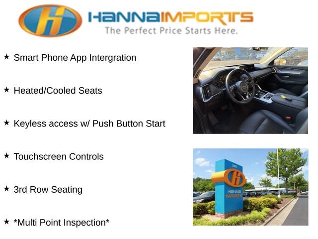 Why shop with Hanna Imports? We specialize in hand-selecting top-quality used cars, trucks, and SUVs for drivers across Raleigh, Durham, Cary, Chapel Hill, and the greater Triangle area of North Carolina. Our massive selection of 1,000+ vehicles on our Raleigh lot is carefully curated to include the most sought-after models, all priced below market value. We believe in transparency and efficiency—our vehicles are aggressively priced from the start, which means no haggling, no hassle, and no wasted time. The price you see is our absolute best price. Whether you're coming from Wake Forest, Apex, Garner, or anywhere in central NC, we’re committed to making your car-buying experience smooth, affordable, and enjoyable. Come see why Hanna Imports is one of the most trusted used car dealerships in North Carolina! Used Mazda CX-90 in Raleigh. Used Mazda CX-90 in North Carolina, 3.692 Axle Ratio, 3rd row seats: bench, 4-Wheel Disc Brakes, 8 Speakers, ABS brakes, Air Conditioning, Alloy wheels, AM/FM radio, AppLink/Apple CarPlay and Android Auto, Auto High-beam Headlights, Automatic temperature control, Brake assist, Bumpers: body-color, Compass, Delay-off headlights, Driver door bin, Driver vanity mirror, Dual front impact airbags, Dual front side impact airbags, E911 Automatic Emergency Notification, Electronic Stability Control, Emergency communication system: MAZDA CONNECT, Exterior Parking Camera Rear, Four wheel independent suspension, Front anti-roll bar, Front Bucket Seats, Front Center Armrest w/Storage, Front dual zone A/C, Front reading lights, Fully automatic headlights, Heads-Up Display, Heated door mirrors, Heated Front Bucket Seats, Heated front seats, Illuminated entry, Infotainment System Voice Command, Knee airbag, Leather Seat Trim, Leather Shift Knob, Leather steering wheel, Low tire pressure warning, Machine Gray Metallic Paint Charge, Mazda Connected Services, Occupant sensing airbag, Outside temperature display, Overhead airbag, Overhead console, Pandora Internet Radio Integration, Panic alarm, Passenger door bin, Passenger vanity mirror, Power door mirrors, Power driver seat, Power Liftgate, Power moonroof, Power passenger seat, Power steering, Power windows, Radio Broadcast Data System Program Information, Radio data system, Radio: AM/FM Sound System, Rain sensing wipers, Rear air conditioning, Rear anti-roll bar, Rear reading lights, Rear seat center armrest, Rear window defroster, Rear window wiper, Remote keyless entry, SMS Text Msg Audio Delivery & Reply, Speed control, Speed-sensing steering, Split folding rear seat, Spoiler, Steering wheel mounted audio controls, Tachometer, Telescoping steering wheel, Tilt steering wheel, Traction control, Trip computer, Turn signal indicator mirrors, Variably intermittent wipers, and Wheels: 19 x 8.5J Aluminum Alloy.