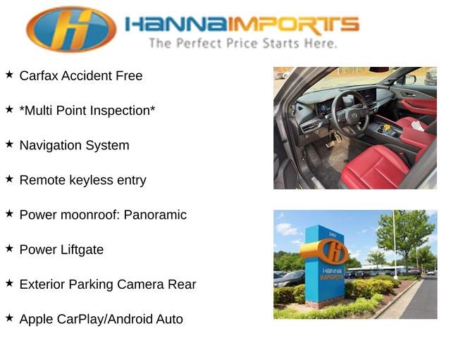 Why shop with Hanna Imports? We specialize in hand-selecting top-quality used cars, trucks, and SUVs for drivers across Raleigh, Durham, Cary, Chapel Hill, and the greater Triangle area of North Carolina. Our massive selection of 1,000+ vehicles on our Raleigh lot is carefully curated to include the most sought-after models, all priced below market value. We believe in transparency and efficiency—our vehicles are aggressively priced from the start, which means no haggling, no hassle, and no wasted time. The price you see is our absolute best price. Whether you're coming from Wake Forest, Apex, Garner, or anywhere in central NC, we’re committed to making your car-buying experience smooth, affordable, and enjoyable. Come see why Hanna Imports is one of the most trusted used car dealerships in North Carolina! Used Acura ZDX in Raleigh. Used Acura ZDX in North Carolina, AWD, Apple CarPlay/Android Auto, Exterior Parking Camera Rear, Heated & Ventilated Front Bucket Seats, Navigation System, Perforated Milano Leather Seat Trim w/Microsuede, Power Liftgate, Power moonroof: Panoramic, Remote keyless entry, 18 Speakers, 4-Wheel Disc Brakes, ABS brakes, Air Conditioning, Alloy wheels, AM/FM radio: SiriusXM, Auto High-beam Headlights, Auto-dimming Rear-View mirror, Automatic temperature control, Bang & Olufsen Premium Sound System, Brake assist, Bumpers: body-color, Compass, Delay-off headlights, Driver door bin, Driver vanity mirror, Dual front impact airbags, Dual front side impact airbags, Electronic Stability Control, Emergency communication system: AcuraLink connected by OnStar, Four wheel independent suspension, Front anti-roll bar, Front Bucket Seats, Front Center Armrest, Front dual zone A/C, Front reading lights, Fully automatic headlights, Garage door transmitter: HomeLink, Heated door mirrors, Heated front seats, Heated steering wheel, Illuminated entry, Knee airbag, Leather steering wheel, Low tire pressure warning, Memory seat, Occupant sensing airbag, Outside temperature display, Overhead airbag, Overhead console, Panic alarm, Passenger door bin, Passenger vanity mirror, Power door mirrors, Power driver seat, Power passenger seat, Power steering, Power windows, Rain sensing wipers, Rear anti-roll bar, Rear reading lights, Rear seat center armrest, Rear window defroster, Rear window wiper, Security system, Speed control, Split folding rear seat, Spoiler, Sport steering wheel, Steering wheel memory, Steering wheel mounted audio controls, TBD Axle Ratio, Telescoping steering wheel, Tilt steering wheel, Traction control, Trip computer, Turn signal indicator mirrors, Variably intermittent wipers, Ventilated front seats, and Wheels: 20 x 9 Berlina Black Aluminum.