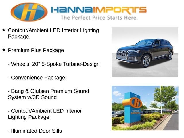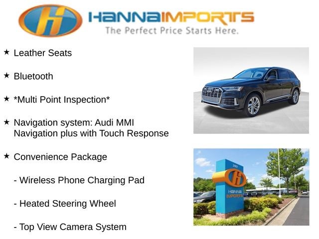 Why shop with Hanna Imports? We specialize in hand-selecting top-quality used cars, trucks, and SUVs for drivers across Raleigh, Durham, Cary, Chapel Hill, and the greater Triangle area of North Carolina. Our massive selection of 1,000+ vehicles on our Raleigh lot is carefully curated to include the most sought-after models, all priced below market value. We believe in transparency and efficiency—our vehicles are aggressively priced from the start, which means no haggling, no hassle, and no wasted time. The price you see is our absolute best price. Whether you're coming from Wake Forest, Apex, Garner, or anywhere in central NC, we’re committed to making your car-buying experience smooth, affordable, and enjoyable. Come see why Hanna Imports is one of the most trusted used car dealerships in North Carolina! Used Audi Q7 in Raleigh. Used Audi Q7 in North Carolina, Contour/Ambient LED Interior Lighting Package, Convenience Package, Premium Plus Package (Bang & Olufsen Premium Sound System w/3D Sound, Illuminated Door Sills, and Wheels: 20 5-Spoke Turbine-Design), Q7 55 Premium Plus quattro, Exterior Parking Camera Rear, Navigation system: Audi MMI Navigation plus with Touch Response, Power Liftgate, Power moonroof: Panoramic, 10 Speakers, 3.204 Axle Ratio, 3rd row seats: bench, 4-Wheel Disc Brakes, ABS brakes, Air Conditioning, Alloy wheels, AM/FM radio: SiriusXM w/ 360L, Auto High-beam Headlights, Auto-dimming door mirrors, Auto-dimming Rear-View mirror, Automatic temperature control, Brake assist, Bumpers: body-color, Compass, Delay-off headlights, Driver door bin, Driver vanity mirror, Dual front impact airbags, Dual front side impact airbags, Electronic Stability Control, Emergency communication system: Audi connect CARE, Four wheel independent suspension, Front anti-roll bar, Front Bucket Seats, Front Center Armrest, Front dual zone A/C, Front fog lights, Front reading lights, Fully automatic headlights, Garage door transmitter: HomeLink, Genuine wood door panel insert, Heated door mirrors, Heated Front Bucket Seats, Heated front seats, Illuminated entry, Leather Seating Surfaces, Leather Shift Knob, Leather steering wheel, Low tire pressure warning, Memory seat, Occupant sensing airbag, Outside temperature display, Overhead airbag, Overhead console, Panic alarm, Passenger door bin, Passenger vanity mirror, Power door mirrors, Power driver seat, Power passenger seat, Power steering, Power windows, Radio data system, Radio: Audi Sound System, Rain sensing wipers, Rear air conditioning, Rear anti-roll bar, Rear fog lights, Rear reading lights, Rear seat center armrest, Rear side impact airbag, Rear window defroster, Rear window wiper, Reclining 3rd row seat, Remote keyless entry, Security system, Speed control, Speed-sensing steering, Split folding rear seat, Spoiler, Steering wheel memory, Steering wheel mounted audio controls, Tachometer, Telescoping steering wheel, Tilt steering wheel, Traction control, Trip computer, Turn signal indicator mirrors, Variably intermittent wipers, and Wheels: 19 5-Arm-Star Design.