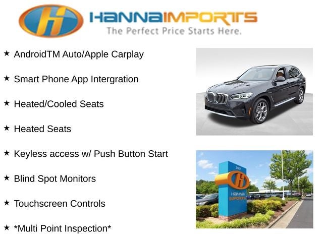 Why shop with Hanna Imports? We specialize in hand-selecting top-quality used cars, trucks, and SUVs for drivers across Raleigh, Durham, Cary, Chapel Hill, and the greater Triangle area of North Carolina. Our massive selection of 1,000+ vehicles on our Raleigh lot is carefully curated to include the most sought-after models, all priced below market value. We believe in transparency and efficiency—our vehicles are aggressively priced from the start, which means no haggling, no hassle, and no wasted time. The price you see is our absolute best price. Whether you're coming from Wake Forest, Apex, Garner, or anywhere in central NC, we’re committed to making your car-buying experience smooth, affordable, and enjoyable. Come see why Hanna Imports is one of the most trusted used car dealerships in North Carolina! Used BMW X3 in Raleigh. Used BMW X3 in North Carolina, Connected Package Pro, Premium Package w/ZPA (Head-Up Display, Heated Front Seats, Heated Steering Wheel, Live Cockpit Pro w/Navigation, Lumbar Support, and Panoramic Moonroof (ZPA)), 8-Speed Automatic Sport, AWD, 12 Speakers, 3.385 Axle Ratio, 4-Wheel Disc Brakes, ABS brakes, Air Conditioning, Alloy wheels, AM/FM Radio, AM/FM radio: SiriusXM, Apple CarPlay & Android Auto Compatibility, Auto High-beam Headlights, Auto-dimming door mirrors, Auto-dimming Rear-View mirror, Automatic temperature control, BMW Assist eCall, BMW TeleServices, Brake assist, Bumpers: body-color, Comfort Access Keyless Entry, ConnectedDrive Services, Delay-off headlights, Driver door bin, Driver vanity mirror, Dual front impact airbags, Dual front side impact airbags, Electronic Stability Control, Emergency communication system: BMW Assist eCall, Enhanced USB & Bluetooth® w/Smartphone Integration, Exterior Parking Camera Rear, Four wheel independent suspension, Front anti-roll bar, Front Bucket Seats, Front Center Armrest, Front dual zone A/C, Front reading lights, Fully automatic headlights, Garage door transmitter, Genuine wood dashboard insert, Genuine wood door panel insert, Heated door mirrors, Hi-Fi Sound System, Illuminated entry, Knee airbag, Leather steering wheel, Low tire pressure warning, Memory seat, Navigation, Navigation System, Occupant sensing airbag, Outside temperature display, Overhead airbag, Panic alarm, Passenger door bin, Passenger vanity mirror, Perforated SensaTec Upholstery, Power door mirrors, Power driver seat, Power Front Seats, Power Liftgate, Power passenger seat, Power steering, Power windows, Radio data system, Rain sensing wipers, Rear air conditioning, Rear anti-roll bar, Rear reading lights, Rear seat center armrest, Rear window defroster, Rear window wiper, Remote Engine Start, Remote keyless entry, Security system, SiriusXM w/360L & 1 Yr Platinum Plan Subscription, Speed control, Speed-sensing steering, Speed-Sensitive Wipers, Split folding rear seat, Spoiler, Sport Seats, Sport steering wheel, Steering wheel mounted audio controls, Tachometer, Telescoping steering wheel, Tilt steering wheel, Traction control, Trip computer, Turn signal indicator mirrors, Variably intermittent wipers, Wheels: 19 x 7.5 Y-Spoke (Style 693), WiFi Hotspot, and Wireless Charging.