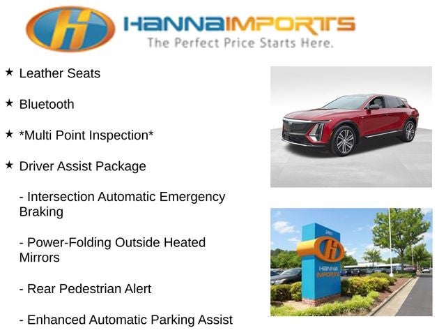 Why shop with Hanna Imports? We specialize in hand-selecting top-quality used cars, trucks, and SUVs for drivers across Raleigh, Durham, Cary, Chapel Hill, and the greater Triangle area of North Carolina. Our massive selection of 1,000+ vehicles on our Raleigh lot is carefully curated to include the most sought-after models, all priced below market value. We believe in transparency and efficiency—our vehicles are aggressively priced from the start, which means no haggling, no hassle, and no wasted time. The price you see is our absolute best price. Whether you're coming from Wake Forest, Apex, Garner, or anywhere in central NC, we’re committed to making your car-buying experience smooth, affordable, and enjoyable. Come see why Hanna Imports is one of the most trusted used car dealerships in North Carolina! Used Cadillac LYRIQ in Raleigh. Used Cadillac LYRIQ in North Carolina, Driver Assist Package (Enhanced Automatic Parking Assist, HD Surround Vision, Intersection Automatic Emergency Braking, Power-Folding Outside Heated Mirrors, Rear Pedestrian Alert, and Side Bicyclist Alert), LYRIQ Luxury, AWD, Power Liftgate, Wheels: 20 Split 6-Spoke Alloy, 11.63 Axle Ratio, 4-Wheel Disc Brakes, 8-Way Power Driver Seat Adjuster, ABS brakes, Air Conditioning, Alloy wheels, AM/FM radio: SiriusXM with 360L, Apple CarPlay/Android Auto, Auto High-beam Headlights, Auto-dimming door mirrors, Auto-dimming Rear-View mirror, Automatic temperature control, Battery Pack Origin, Brake assist, Bumpers: body-color, Compass, Delay-off headlights, Driver & Front Passenger Heated Seats, Driver 4-Way Power Lumbar Seat Adjustment, Driver door bin, Driver vanity mirror, Dual front impact airbags, Dual front side impact airbags, Electronic Stability Control, Emergency communication system: OnStar and Cadillac connected services capable, Four wheel independent suspension, Front & Rear All-Weather Floor Mats, Front anti-roll bar, Front Bucket Seats, Front Center Armrest, Front dual zone A/C, Front License Plate Bracket, Front Passenger 4-Way Power Lumbar Seat Adjustment, Front reading lights, Fully automatic headlights, Garage door transmitter, Heated door mirrors, Heated front seats, Heated steering wheel, Hitch Guidance w/Trailering Assist Guideline, Hitch View, Illuminated entry, Inteluxe Seat Trim, Knee airbag, Leather steering wheel, Low tire pressure warning, Memory seat, Navigation system: Google Automotive Services Capable, Occupant sensing airbag, Outside temperature display, Overhead airbag, Overhead console, Panic alarm, Passenger door bin, Passenger vanity mirror, Power door mirrors, Power driver seat, Power passenger seat, Power steering, Power windows, Premium Suspension, Radio data system, Radio: Google Built-In Infotainment Experience, Rain sensing wipers, Rear anti-roll bar, Rear reading lights, Rear seat center armrest, Rear window defroster, Remote keyless entry, Security system, SiriusXM w/360L, Speed control, Speed-sensing steering, Split folding rear seat, Spoiler, Steering wheel memory, Steering wheel mounted audio controls, Telescoping steering wheel, Tilt steering wheel, Traction control, Trip computer, Turn signal indicator mirrors, and Variably intermittent wipers.