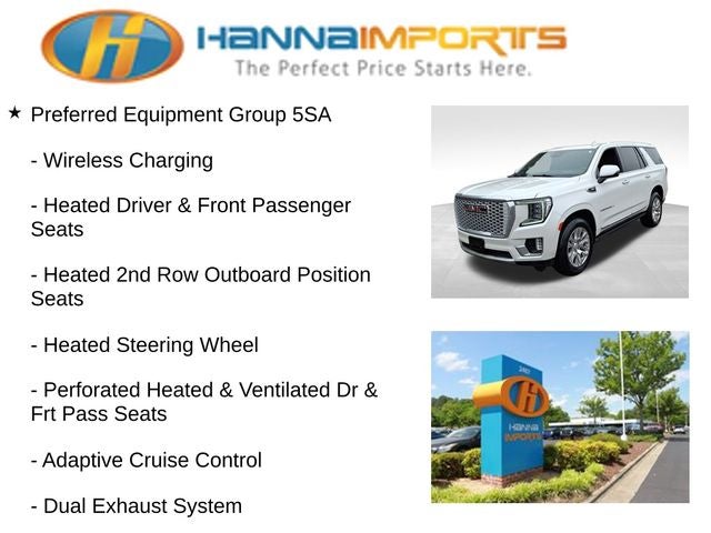 Why shop with Hanna Imports? We specialize in hand-selecting top-quality used cars, trucks, and SUVs for drivers across Raleigh, Durham, Cary, Chapel Hill, and the greater Triangle area of North Carolina. Our massive selection of 1,000+ vehicles on our Raleigh lot is carefully curated to include the most sought-after models, all priced below market value. We believe in transparency and efficiency—our vehicles are aggressively priced from the start, which means no haggling, no hassle, and no wasted time. The price you see is our absolute best price. Whether you're coming from Wake Forest, Apex, Garner, or anywhere in central NC, we’re committed to making your car-buying experience smooth, affordable, and enjoyable. Come see why Hanna Imports is one of the most trusted used car dealerships in North Carolina! Used GMC Yukon in Raleigh. Used GMC Yukon in North Carolina, Advanced Security Package (Glass Breakage Sensor, Theft-Deterrent Alarm System, Vehicle Inclination Sensor, and Vehicle Interior Movement Sensor), Advanced Technology Package (Enhanced Automatic Parking Assist, Inside Rearview Auto-Dimming Rear Camera Mirror, Rear Camera Mirror Washer, Reverse Automatic Braking, and Super Cruise), Preferred Equipment Group 5SA (12-Way Power Seat Adjusters, 15 Diagonal Multi-Color Head-Up Display, 2 Presets For Outside Rearview Mirrors, 3rd Row 60/40 Power-Folding Split-Bench Seat, Adaptive Cruise Control, Bose 14-Speaker Surround w/CenterPoint, Bright Front & Rear Door Sill Plates, Chrome Door Handles w/Body-Color Strip, Dual Exhaust System, Enhanced Automatic Emergency Braking, Floor Console, Galvano Bodyside Moldings, Hands-Free Power Programmable Rear Liftgate, HD Surround Vision, Heated 2nd Row Outboard Position Seats, Heated Driver & Front Passenger Seats, Heated Steering Wheel, Hill Descent Control, Inside Rear-View Auto-Dimming Mirror, Outside Heated Power-Adjustable Mirrors, Perforated Heated & Ventilated Dr & Frt Pass Seats, Power Release 2nd Row Bucket Seats, Power Tilt & Telescopic Steering Column, Rear Pedestrian Alert, Safety Alert Seat, Universal Home Remote, and Wireless Charging), License Plate Front Mounting Package, Max Trailering Package, 4WD, 14 Speakers, 3.23 Rear Axle Ratio, 3rd row seats: split-bench, 4-Wheel Disc Brakes, ABS brakes, Adaptive suspension, Air Conditioning, Alloy wheels, AM/FM radio: SiriusXM with 360L, AM/FM Stereo, Apple CarPlay/Android Auto, Auto High-beam Headlights, Auto-dimming door mirrors, Auto-dimming Rear-View mirror, Auto-leveling suspension, Automatic Emergency Braking, Automatic temperature control, Bodyside moldings, Brake assist, Bumpers: body-color, Compass, Delay-off headlights, Driver door bin, Driver vanity mirror, Dual front impact airbags, Dual fron