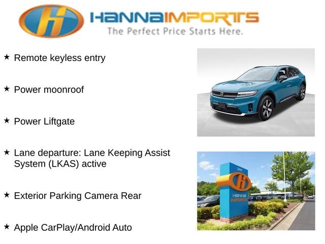 Why shop with Hanna Imports? We specialize in hand-selecting top-quality used cars, trucks, and SUVs for drivers across Raleigh, Durham, Cary, Chapel Hill, and the greater Triangle area of North Carolina. Our massive selection of 1,000+ vehicles on our Raleigh lot is carefully curated to include the most sought-after models, all priced below market value. We believe in transparency and efficiency—our vehicles are aggressively priced from the start, which means no haggling, no hassle, and no wasted time. The price you see is our absolute best price. Whether you're coming from Wake Forest, Apex, Garner, or anywhere in central NC, we’re committed to making your car-buying experience smooth, affordable, and enjoyable. Come see why Hanna Imports is one of the most trusted used car dealerships in North Carolina! Used Honda Prologue in Raleigh. Used Honda Prologue in North Carolina, Prologue Touring, AWD, Apple CarPlay/Android Auto, Bose Premium Audio System, Exterior Parking Camera Rear, Lane departure: Lane Keeping Assist System (LKAS) active, Navigation System, Power Liftgate, Power moonroof, Remote keyless entry, 12 Speakers, 19 x 8.5 Alloy Wheels, 4-Wheel Disc Brakes, ABS brakes, Air Conditioning, Alloy wheels, AM/FM radio: SiriusXM, Auto High-beam Headlights, Auto-dimming Rear-View mirror, Automatic temperature control, Axle Ratio: TBD, Brake assist, Bumpers: body-color, Compass, Delay-off headlights, Driver door bin, Driver vanity mirror, Dual front impact airbags, Dual front side impact airbags, Electronic Stability Control, Emergency communication system: HondaLink connected by OnStar, Four wheel independent suspension, Front anti-roll bar, Front Bucket Seats, Front Center Armrest, Front dual zone A/C, Front fog lights, Front reading lights, Fully automatic headlights, Garage door transmitter: HomeLink, Heated door mirrors, Heated Front Bucket Seats, Heated front seats, Illuminated entry, Knee airbag, Leather Seat Trim, Leather steering wheel, Low tire pressure warning, Memory seat, Occupant sensing airbag, Outside temperature display, Overhead airbag, Overhead console, Panic alarm, Passenger door bin, Passenger vanity mirror, Power door mirrors, Power driver seat, Power passenger seat, Power steering, Power windows, Rear anti-roll bar, Rear reading lights, Rear seat center armrest, Rear window defroster, Rear window wiper, Speed control, Split folding rear seat, Spoiler, Steering wheel mounted audio controls, Telescoping steering wheel, Tilt steering wheel, Traction control, Trip computer, Turn signal indicator mirrors, and Variably intermittent wipers.
