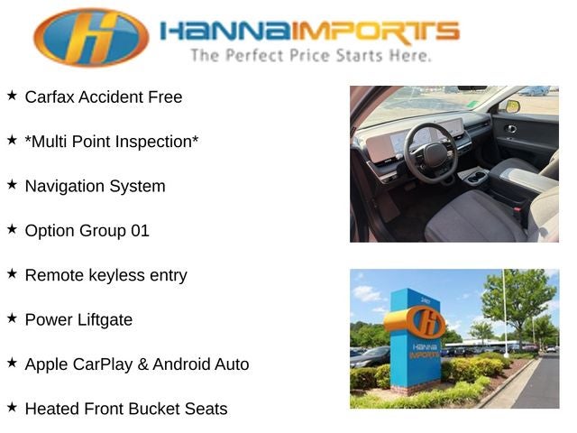 Why shop with Hanna Imports? We specialize in hand-selecting top-quality used cars, trucks, and SUVs for drivers across Raleigh, Durham, Cary, Chapel Hill, and the greater Triangle area of North Carolina. Our massive selection of 1,000+ vehicles on our Raleigh lot is carefully curated to include the most sought-after models, all priced below market value. We believe in transparency and efficiency—our vehicles are aggressively priced from the start, which means no haggling, no hassle, and no wasted time. The price you see is our absolute best price. Whether you're coming from Wake Forest, Apex, Garner, or anywhere in central NC, we’re committed to making your car-buying experience smooth, affordable, and enjoyable. Come see why Hanna Imports is one of the most trusted used car dealerships in North Carolina! Used Hyundai IONIQ 5 in Raleigh. Used Hyundai IONIQ 5 in North Carolina, Option Group 01, IONIQ 5 SEL, Apple CarPlay & Android Auto, Heated Front Bucket Seats, Navigation System, Power Liftgate, Remote keyless entry, 4-Wheel Disc Brakes, 4.71 Axle Ratio, 6 Speakers, ABS brakes, Air Conditioning, Alloy wheels, AM/FM radio: SiriusXM, Auto High-beam Headlights, Auto-dimming Rear-View mirror, Automatic temperature control, Bodyside moldings, Brake assist, Bumpers: body-color, Cargo Net, Carpeted Floor Mats, Charging Port Applique, Delay-off headlights, Driver door bin, Driver vanity mirror, Dual front impact airbags, Dual front side impact airbags, Electronic Stability Control, Emergency communication system: Bluelink+, Four wheel independent suspension, Front anti-roll bar, Front Bucket Seats, Front Center Armrest w/Storage, Front dual zone A/C, Front reading lights, Fully automatic headlights, Garage door transmitter: HomeLink, harman/kardon® Speakers, Heated door mirrors, Heated front seats, Heated steering wheel, Illuminated entry, Leather steering wheel, Low tire pressure warning, Occupant sensing airbag, Outside temperature display, Overhead airbag, Overhead console, Panic alarm, Passenger door bin, Passenger vanity mirror, Power door mirrors, Power driver seat, Power steering, Power windows, Radio: AM/FM/SiriusXM/HD Display Audio System, Rear anti-roll bar, Rear reading lights, Rear side impact airbag, Rear window defroster, Security system, Speed control, Speed-sensing steering, Split folding rear seat, Spoiler, Stain-Resistant Cloth Seating Surfaces, Steering wheel mounted audio controls, Telescoping steering wheel, Tilt steering wheel, Traction control, Trip computer, Turn signal indicator mirrors, Variably intermittent wipers, and Wheels: 19 x 7.5J Aero Alloy.