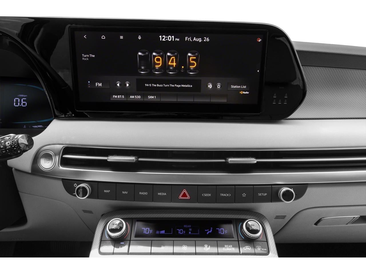 - Radio: AM/FM/MP3 Audio System -inc: 12.3" color touchscreen display, onboard navigation w/traffic flow including incident data via HD Radio (HERE), Over-the-Air (OTA) map updates, SiriusXM, USB, Android Auto and Apple CarPlay, dynamic voice recognition, rear seat quiet mode, Bluetooth® hands-free connectivity w/multiple device connection and Bluelink Connected Car System