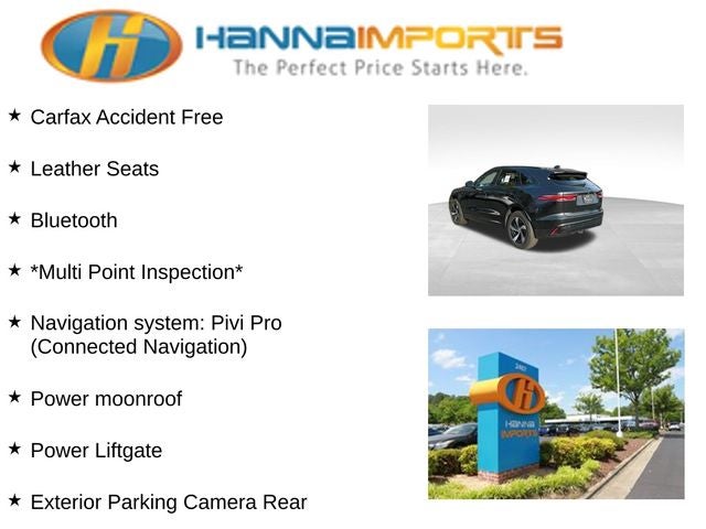 Why shop with Hanna Imports? We specialize in hand-selecting top-quality used cars, trucks, and SUVs for drivers across Raleigh, Durham, Cary, Chapel Hill, and the greater Triangle area of North Carolina. Our massive selection of 1,000+ vehicles on our Raleigh lot is carefully curated to include the most sought-after models, all priced below market value. We believe in transparency and efficiency—our vehicles are aggressively priced from the start, which means no haggling, no hassle, and no wasted time. The price you see is our absolute best price. Whether you're coming from Wake Forest, Apex, Garner, or anywhere in central NC, we’re committed to making your car-buying experience smooth, affordable, and enjoyable. Come see why Hanna Imports is one of the most trusted used car dealerships in North Carolina! Used Jaguar F-PACE in Raleigh. Used Jaguar F-PACE in North Carolina, AWD, Apple CarPlay/Android Auto, Exterior Parking Camera Rear, Navigation system: Pivi Pro (Connected Navigation), Power Liftgate, Power moonroof, 11 Speakers, 3.73 Axle Ratio, 4-Wheel Disc Brakes, ABS brakes, Air Conditioning, Alloy wheels, AM/FM radio: SiriusXM, Auto High-beam Headlights, Auto tilt-away steering wheel, Auto-dimming door mirrors, Auto-dimming Rear-View mirror, Automatic temperature control, Brake assist, Bumpers: body-color, Compass, Delay-off headlights, Driver door bin, Driver vanity mirror, Dual front impact airbags, Dual front side impact airbags, Electronic Stability Control, Emergency communication system: Remote SOS Emergency Call, Four wheel independent suspension, Front anti-roll bar, Front Bucket Seats, Front Center Armrest, Front dual zone A/C, Front reading lights, Fully automatic headlights, Garage door transmitter: HomeLink, Heated door mirrors, Heated front seats, Heated Front Sport Bucket Seats, Heated steering wheel, Illuminated entry, Leather Shift Knob, Leather steering wheel, Low tire pressure warning, Memory seat, Occupant sensing airbag, Outside temperature display, Overhead airbag, Overhead console, Panic alarm, Passenger door bin, Passenger vanity mirror, Perforated DuoLeather Seat Trim, Power door mirrors, Power driver seat, Power passenger seat, Power steering, Power windows, Radio data system, Radio: Meridian 400W Sound System, Rain sensing wipers, Rear anti-roll bar, Rear fog lights, Rear reading lights, Rear seat center armrest, Rear window defroster, Rear window wiper, Remote keyless entry, Security system, Speed control, Speed-sensing steering, Split folding rear seat, Spoiler, Sport steering wheel, Steering wheel memory, Steering wheel mounted audio controls, Tachometer, Telescoping steering wheel, Tilt steering wheel, Traction control, Trip computer, Turn signal indicator mirrors, Variably intermittent wipers, and Wheels: 19 Diamond Turned (Style 5103)