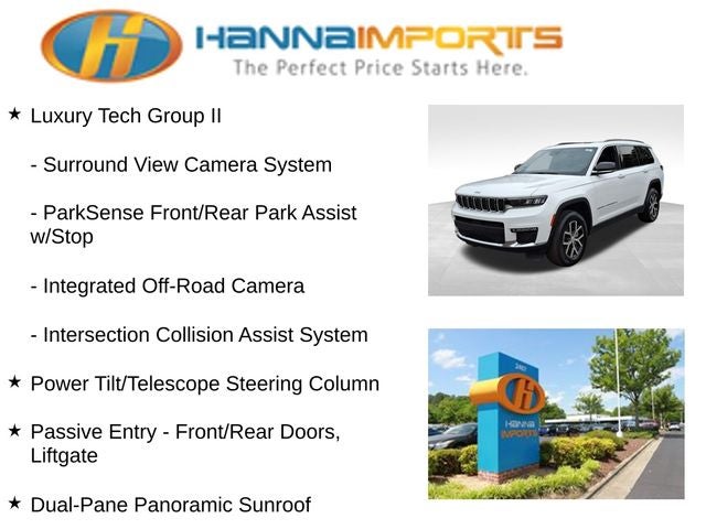 Why shop with Hanna Imports? We specialize in hand-selecting top-quality used cars, trucks, and SUVs for drivers across Raleigh, Durham, Cary, Chapel Hill, and the greater Triangle area of North Carolina. Our massive selection of 1,000+ vehicles on our Raleigh lot is carefully curated to include the most sought-after models, all priced below market value. We believe in transparency and efficiency—our vehicles are aggressively priced from the start, which means no haggling, no hassle, and no wasted time. The price you see is our absolute best price. Whether you're coming from Wake Forest, Apex, Garner, or anywhere in central NC, we’re committed to making your car-buying experience smooth, affordable, and enjoyable. Come see why Hanna Imports is one of the most trusted used car dealerships in North Carolina! Used Jeep Grand Cherokee L in Raleigh. Used Jeep Grand Cherokee L in North Carolina, Luxury Tech Group II (2nd Row Manual Window Shades, Auto-Dimming Exterior Driver Mirror, Capri Leatherette w/Axis II Seats, Integrated Off-Road Camera, Intersection Collision Assist System, Memory Steering Column, ParkSense Front/Rear Park Assist w/Stop, Passive Entry - Front/Rear Doors, Liftgate, Power Tilt/Telescope Steering Column, Rain Sensitive Windshield Wipers, Rear Back Up Camera Washer, Rearview Autodim Digital Display Mirror, Surround View Camera System, Ventilated Front Seats, and Wireless Charging Pad), Quick Order Package 23E, Grand Cherokee L Limited, 4WD, 3rd row seats: split-bench, Dual-Pane Panoramic Sunroof, Interior Rear Facing Camera, Navigation System, ParkView Rear Back-Up Camera, Power Liftgate, 3.45 Rear Axle Ratio, 4-Wheel Disc Brakes, 6 Speakers, ABS brakes, Active Noise Control System, Air Conditioning, Alloy wheels, AM/FM radio: SiriusXM with 360L, Anti-whiplash front head restraints, Audio memory, Auto High-beam Headlights, Automatic temperature control, Brake assist, Bumpers: body-color, Capri Leatherette Seats, Compass, Delay-off headlights, Driver door bin, Driver vanity mirror, Dual front impact airbags, Dual front side impact airbags, Electronic Stability Control, Emergency communication system, Four wheel independent suspension, Front anti-roll bar, Front Bucket Seats, Front Center Armrest w/Storage, Front dual zone A/C, Front fog lights, Front License Plate Bracket, Front reading lights, Fully automatic headlights, Garage door transmitter, Heated door mirrors, Heated front seats, Heated rear seats, Heated steering wheel, Illuminated entry, Knee airbag, Low tire pressure warning, Manual Fold Seatbacks, Memory seat, Normal Duty Suspension, Occupant sensing airbag, Outside temperature display, Overhead airbag, Overhead console, Panic alarm, Passenger door bin, Passenger vanity mirror, Power door mirrors, Power driver seat, Power passenger seat, Power steering, Power windows, Radio data system, Radio: Uconnect 5 Nav w/10.1 Display, Rear air conditioning, Rear anti-roll bar, Rear reading lights, Rear window defroster, Rear window wiper, Reclining 3rd row seat, Remote keyless entry, Security system, Speed control, Speed-Se