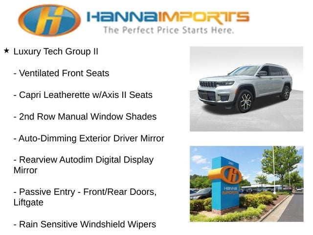 Why shop with Hanna Imports? We specialize in hand-selecting top-quality used cars, trucks, and SUVs for drivers across Raleigh, Durham, Cary, Chapel Hill, and the greater Triangle area of North Carolina. Our massive selection of 1,000+ vehicles on our Raleigh lot is carefully curated to include the most sought-after models, all priced below market value. We believe in transparency and efficiency—our vehicles are aggressively priced from the start, which means no haggling, no hassle, and no wasted time. The price you see is our absolute best price. Whether you're coming from Wake Forest, Apex, Garner, or anywhere in central NC, we’re committed to making your car-buying experience smooth, affordable, and enjoyable. Come see why Hanna Imports is one of the most trusted used car dealerships in North Carolina! Used Jeep Grand Cherokee L in Raleigh. Used Jeep Grand Cherokee L in North Carolina, Luxury Tech Group II (2nd Row Manual Window Shades, Auto-Dimming Exterior Driver Mirror, Capri Leatherette w/Axis II Seats, Integrated Off-Road Camera, Intersection Collision Assist System, Memory Steering Column, ParkSense Front/Rear Park Assist w/Stop, Passive Entry - Front/Rear Doors, Liftgate, Power Tilt/Telescope Steering Column, Rain Sensitive Windshield Wipers, Rear Back Up Camera Washer, Rearview Autodim Digital Display Mirror, Surround View Camera System, Ventilated Front Seats, and Wireless Charging Pad), Quick Order Package 23E, Grand Cherokee L Limited, Dual-Pane Panoramic Sunroof, Interior Rear Facing Camera, Navigation System, ParkView Rear Back-Up Camera, Power Liftgate, Remote keyless entry, 3.45 Rear Axle Ratio, 3rd row seats: split-bench, 4-Wheel Disc Brakes, 6 Speakers, ABS brakes, Active Noise Control System, Air Conditioning, Alloy wheels, AM/FM radio: SiriusXM with 360L, Anti-whiplash front head restraints, Audio memory, Auto High-beam Headlights, Automatic temperature control, Brake assist, Bumpers: body-color, Capri Leatherette Seats, Compass, Delay-off headlights, Driver door bin, Driver vanity mirror, Dual front impact airbags, Dual front side impact airbags, Electronic Stability Control, Emergency communication system, Four wheel independent suspension, Front anti-roll bar, Front Bucket Seats, Front Center Armrest w/Storage, Front dual zone A/C, Front fog lights, Front License Plate Bracket, Front reading lights, Fully automatic headlights, Garage door transmitter, Heated door mirrors, Heated front seats, Heated rear seats, Heated steering wheel, Illuminated entry, Knee airbag, Low tire pressure warning, Manual Fold Seatbacks, Memory seat, Normal Duty Suspension, Occupant sensing airbag, Outside temperature display, Overhead airbag, Overhead console, Panic alarm, Passenger door bin, Passenger vanity mirror, Power door mirrors, Power driver seat, Power passenger seat, Power steering, Power windows, Radio data system, Radio: Uconnect 5 Nav w/10.1 Display, Rear air conditioning, Rear anti-roll bar, Rear reading lights, Rear window defroster, Rear window wiper, Reclining 3rd row seat, Security system, Speed control, Speed-Sensitive Wipers, Split folding rea