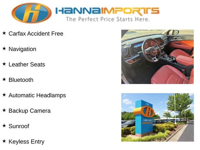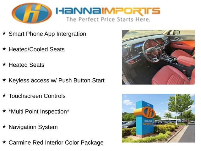 Why shop with Hanna Imports? We specialize in hand-selecting top-quality used cars, trucks, and SUVs for drivers across Raleigh, Durham, Cary, Chapel Hill, and the greater Triangle area of North Carolina. Our massive selection of 1,000+ vehicles on our Raleigh lot is carefully curated to include the most sought-after models, all priced below market value. We believe in transparency and efficiency—our vehicles are aggressively priced from the start, which means no haggling, no hassle, and no wasted time. The price you see is our absolute best price. Whether you're coming from Wake Forest, Apex, Garner, or anywhere in central NC, we’re committed to making your car-buying experience smooth, affordable, and enjoyable. Come see why Hanna Imports is one of the most trusted used car dealerships in North Carolina! Used Kia Sportage in Raleigh. Used Kia Sportage in North Carolina, Carmine Red Interior Color Package, Sportage SX-Prestige, Navigation System, 4-Wheel Disc Brakes, 8 Speakers, ABS brakes, Air Conditioning, Alloy wheels, AM/FM radio: SiriusXM, Apple CarPlay & Android Auto, Auto High-beam Headlights, Automatic temperature control, Axle Ratio: 3.648, Brake assist, Bumpers: body-color, Carpeted Floor Mats, Compass, Delay-off headlights, Driver door bin, Driver vanity mirror, Dual front impact airbags, Dual front side impact airbags, EC Mirror w/HomeLink, Electronic Stability Control, Emergency communication system, Four wheel independent suspension, Front anti-roll bar, Front Bucket Seats, Front Center Armrest, Front dual zone A/C, Front fog lights, Front reading lights, Fully automatic headlights, harman/kardon® Speakers, Heated & Ventilated Front Bucket Seats, Heated door mirrors, Heated front seats, Heated steering wheel, Illuminated entry, Leather Shift Knob, Leather steering wheel, Low tire pressure warning, Memory seat, Occupant sensing airbag, Outside temperature display, Overhead airbag, Overhead console, Panic alarm, Passenger door bin, Passenger vanity mirror, Power door mirrors, Power driver seat, Power Liftgate, Power moonroof, Power passenger seat, Power steering, Power windows, Premium Leatherette Seat Trim, Radio: AM/FM/HD Audio System, Rain sensing wipers, Rear anti-roll bar, Rear reading lights, Rear seat center armrest, Rear side impact airbag, Rear window defroster, Rear window wiper, Remote keyless entry, Security system, Speed control, Speed-sensing steering, Split folding rear seat, Spoiler, Steering wheel mounted audio controls, Tachometer, Telescoping steering wheel, Tilt steering wheel, Traction control, Trip computer, Turn signal indicator mirrors, Variably intermittent wipers, Ventilated front seats, and Wheels: 19 Gloss Black Alloy.