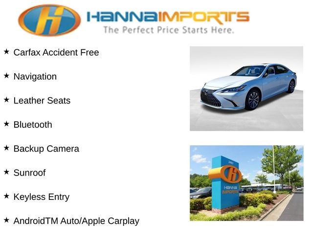Why shop with Hanna Imports? We specialize in hand-selecting top-quality used cars, trucks, and SUVs for drivers across Raleigh, Durham, Cary, Chapel Hill, and the greater Triangle area of North Carolina. Our massive selection of 1,000+ vehicles on our Raleigh lot is carefully curated to include the most sought-after models, all priced below market value. We believe in transparency and efficiency—our vehicles are aggressively priced from the start, which means no haggling, no hassle, and no wasted time. The price you see is our absolute best price. Whether you're coming from Wake Forest, Apex, Garner, or anywhere in central NC, we’re committed to making your car-buying experience smooth, affordable, and enjoyable. Come see why Hanna Imports is one of the most trusted used car dealerships in North Carolina! Used Lexus ES in Raleigh. Used Lexus ES in North Carolina, Black w/Wood Black Trim w/Leather Seat Trim, Exterior Parking Camera Rear, Power moonroof, 10 Speakers, 10-Way Power Adjustable Front Seats, 4-Wheel Disc Brakes, ABS brakes, Air Conditioning, Alloy wheels, AM/FM radio: SiriusXM, Auto High-beam Headlights, Auto-dimming door mirrors, Auto-dimming Rear-View mirror, Automatic temperature control, Brake assist, Bumpers: body-color, Compass, Delay-off headlights, Driver door bin, Driver vanity mirror, Dual front impact airbags, Dual front side impact airbags, Electronic Stability Control, Emergency communication system, Four wheel independent suspension, Front anti-roll bar, Front Bucket Seats, Front Center Armrest, Front dual zone A/C, Front reading lights, Fully automatic headlights, Garage door transmitter: HomeLink, Heated door mirrors, Illuminated entry, Knee airbag, Leather Shift Knob, Leather steering wheel, Low tire pressure warning, Occupant sensing airbag, Outside temperature display, Overhead airbag, Overhead console, Panic alarm, Passenger door bin, Passenger vanity mirror, Perforated NuLuxe Seat Trim, Power door mirrors, Power driver seat, Power passenger seat, Power steering, Power windows, Radio data system, Radio: Lexus Interface w/8 Multimedia Touch Scrn, Rear anti-roll bar, Rear reading lights, Rear seat center armrest, Rear side impact airbag, Rear window defroster, Remote keyless entry, Security system, Speed control, Speed-sensing steering, Steering wheel mounted audio controls, Tachometer, Telescoping steering wheel, Tilt steering wheel, Traction control, Trip computer, Turn signal indicator mirrors, Variably intermittent wipers, Wheels: 17 x 7.5J Twin-V-Spoke Alloy, and Wireless Apple CarPlay/Wireless Android Auto.