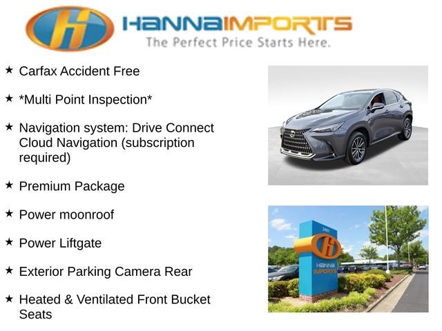 Why shop with Hanna Imports? We specialize in hand-selecting top-quality used cars, trucks, and SUVs for drivers across Raleigh, Durham, Cary, Chapel Hill, and the greater Triangle area of North Carolina. Our massive selection of 1,000+ vehicles on our Raleigh lot is carefully curated to include the most sought-after models, all priced below market value. We believe in transparency and efficiency—our vehicles are aggressively priced from the start, which means no haggling, no hassle, and no wasted time. The price you see is our absolute best price. Whether you're coming from Wake Forest, Apex, Garner, or anywhere in central NC, we’re committed to making your car-buying experience smooth, affordable, and enjoyable. Come see why Hanna Imports is one of the most trusted used car dealerships in North Carolina! Used Lexus NX in Raleigh. Used Lexus NX in North Carolina, Premium Package, NX 350h Premium, 2.5L I4 DOHC 16V, AWD, Exterior Parking Camera Rear, Heated & Ventilated Front Bucket Seats, Navigation system: Drive Connect Cloud Navigation (subscription required), Power Liftgate, Power moonroof, 10 Speakers, 18 Wheels, 4-Wheel Disc Brakes, ABS brakes, Air Conditioning, Alloy wheels, AM/FM radio: SiriusXM, Anti-whiplash front head restraints, Auto High-beam Headlights, Auto tilt-away steering wheel, Auto-dimming door mirrors, Auto-dimming Rear-View mirror, Automatic temperature control, Axle Ratio: 10.781, Brake assist, Bumpers: body-color, Delay-off headlights, Driver door bin, Driver vanity mirror, Dual front impact airbags, Dual front side impact airbags, Electronic Stability Control, Emergency communication system, Four wheel independent suspension, Front anti-roll bar, Front Bucket Seats, Front Center Armrest, Front dual zone A/C, Front fog lights, Front reading lights, Fully automatic headlights, Garage door transmitter: HomeLink, Heated door mirrors, Heated front seats, Illuminated entry, Knee airbag, Leather Shift Knob, Leather steering wheel, Low tire pressure warning, Memory seat, NuLuxe Seat Trim, Occupant sensing airbag, Outside temperature display, Overhead airbag, Overhead console, Panic alarm, Passenger door bin, Passenger vanity mirror, Power door mirrors, Power driver seat, Power passenger seat, Power steering, Power windows, Radio data system, Rain sensing wipers, Rear anti-roll bar, Rear reading lights, Rear seat center armrest, Rear window defroster, Rear window wiper, Remote keyless entry, Security system, Speed control, Speed-sensing steering, Speed-Sensitive Wipers, Split folding rear seat, Spoiler, Steering wheel memory, Steering wheel mounted audio controls, Tachometer, Telescoping steering wheel, Tilt steering wheel, Traction control, Trip computer, Turn signal indicator mirrors, Variably intermittent wipers, and Ventilated front seats.