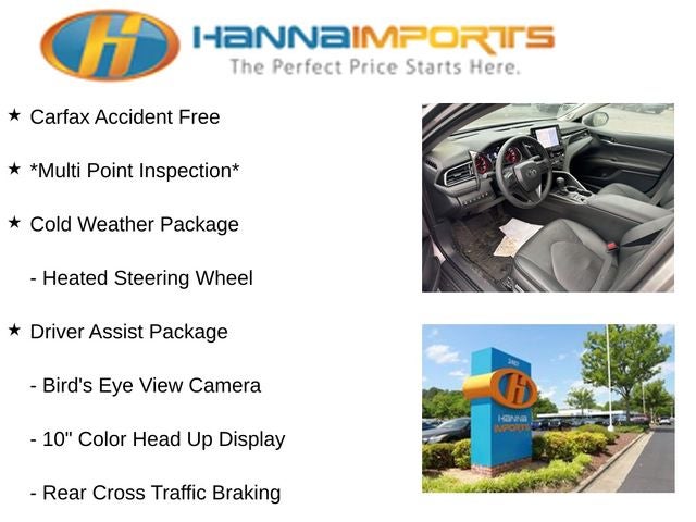Why shop with Hanna Imports? We specialize in hand-selecting top-quality used cars, trucks, and SUVs for drivers across Raleigh, Durham, Cary, Chapel Hill, and the greater Triangle area of North Carolina. Our massive selection of 1,000+ vehicles on our Raleigh lot is carefully curated to include the most sought-after models, all priced below market value. We believe in transparency and efficiency—our vehicles are aggressively priced from the start, which means no haggling, no hassle, and no wasted time. The price you see is our absolute best price. Whether you're coming from Wake Forest, Apex, Garner, or anywhere in central NC, we’re committed to making your car-buying experience smooth, affordable, and enjoyable. Come see why Hanna Imports is one of the most trusted used car dealerships in North Carolina! Used Toyota Camry in Raleigh. Used Toyota Camry in North Carolina, Cold Weather Package (Heated Steering Wheel), Driver Assist Package (10 Color Head Up Display, Bird's Eye View Camera, Intelligent Clearance Sonar, Multi-Stage Ventilated Front Seats, and Rear Cross Traffic Braking), Navigation Package (Radio: Premium Audio w/JBL), Sport Preferred Accessory Package w/AWL (TMS), Camry XSE, Black Leather, Exterior Parking Camera Rear, Panoramic Glass Roof, 4-Wheel Disc Brakes, 6 Speakers, ABS brakes, Air Conditioning, Alloy wheels, AM/FM radio: SiriusXM, Apple CarPlay/Android Auto, Auto High-beam Headlights, Auto-dimming Rear-View mirror, Automatic temperature control, Brake assist, Bumpers: body-color, Delay-off headlights, Driver door bin, Driver vanity mirror, Dual front impact airbags, Dual front side impact airbags, Electronic Stability Control, Emergency communication system: Safety Connect (1-year trial), Four wheel independent suspension, Front anti-roll bar, Front Bucket Seats, Front Center Armrest, Front dual zone A/C, Front reading lights, Fully automatic headlights, Garage door transmitter: HomeLink, Heated door mirrors, Heated front seats, Illuminated entry, Knee airbag, Leather steering wheel, Low tire pressure warning, Multi-Stage Heated Front Bucket Seats, Occupant sensing airbag, Outside temperature display, Overhead airbag, Overhead console, Panic alarm, Passenger door bin, Passenger vanity mirror, Perforated Leather Seat Trim, Power door mirrors, Power driver seat, Power passenger seat, Power steering, Power windows, Radio data system, Radio: Audio Plus, Rear anti-roll bar, Rear reading lights, Rear seat center armrest, Rear side impact airbag, Rear window defroster, Remote keyless entry, Security system, Speed control, Speed-sensing steering, Split folding rear seat, Spoiler, Steering wheel mounted audio controls, Tachometer, Telescoping steering wheel, Tilt steering wheel, Traction control, Trip computer, Turn signal indicator mirrors, Variably intermittent wipers, Wheel Locks (WL) (TMS), and Wheels: 19 x 8J Alloy.