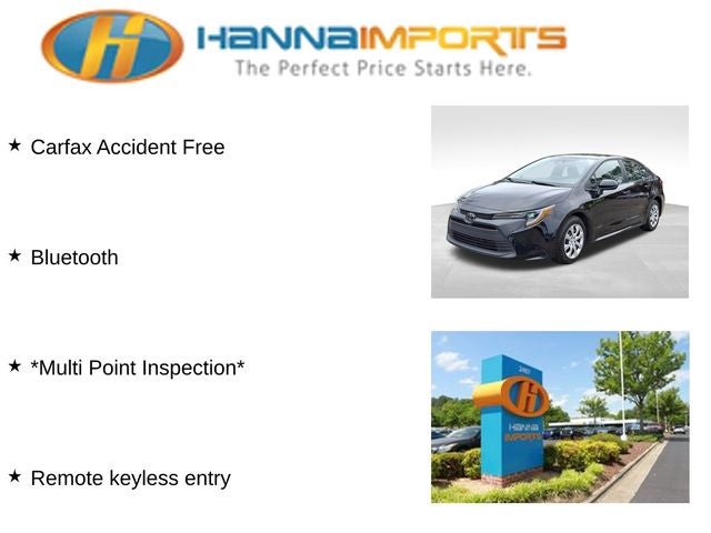 Why shop with Hanna Imports? We specialize in hand-selecting top-quality used cars, trucks, and SUVs for drivers across Raleigh, Durham, Cary, Chapel Hill, and the greater Triangle area of North Carolina. Our massive selection of 1,000+ vehicles on our Raleigh lot is carefully curated to include the most sought-after models, all priced below market value. We believe in transparency and efficiency—our vehicles are aggressively priced from the start, which means no haggling, no hassle, and no wasted time. The price you see is our absolute best price. Whether you're coming from Wake Forest, Apex, Garner, or anywhere in central NC, we’re committed to making your car-buying experience smooth, affordable, and enjoyable. Come see why Hanna Imports is one of the most trusted used car dealerships in North Carolina! Used Toyota Corolla in Raleigh. Used Toyota Corolla in North Carolina, Corolla LE, Remote keyless entry, 16 Steel Wheels w/Covers, 4-Wheel Disc Brakes, 6 Speakers, ABS brakes, Air Conditioning, AM/FM radio: SiriusXM, Auto High-beam Headlights, Automatic temperature control, Brake assist, Bumpers: body-color, Delay-off headlights, Driver door bin, Driver vanity mirror, Dual front impact airbags, Dual front side impact airbags, Electronic Stability Control, Emergency communication system: Safety Connect (up to 10-year trial subscription), Exterior Parking Camera Rear, Fabric Seat Trim, Front anti-roll bar, Front Bucket Seats, Front Center Armrest, Front reading lights, Front wheel independent suspension, Fully automatic headlights, Illuminated entry, Knee airbag, Low tire pressure warning, Occupant sensing airbag, Outside temperature display, Overhead airbag, Panic alarm, Passenger door bin, Passenger vanity mirror, Power door mirrors, Power steering, Power windows, Radio data system, Radio: 8 Toyota Audio Multimedia, Rear anti-roll bar, Rear seat center armrest, Rear side impact airbag, Rear window defroster, Speed control, Split folding rear seat, Steering wheel mounted audio controls, Tachometer, Telescoping steering wheel, Tilt steering wheel, Traction control, and Trip computer.