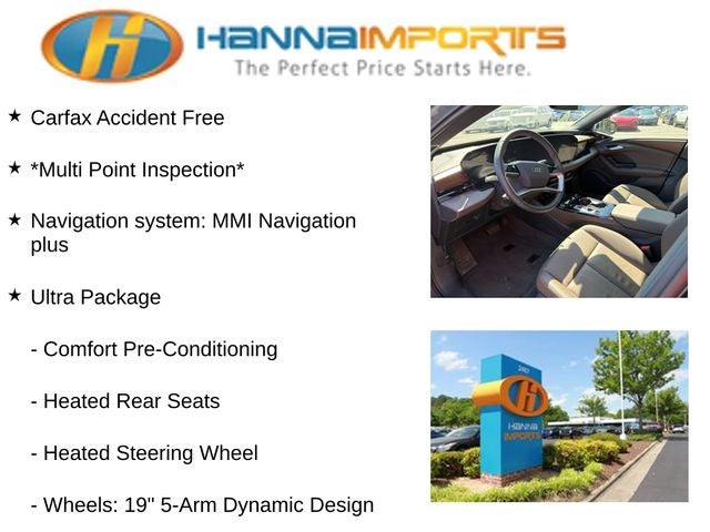 Why shop with Hanna Imports? We specialize in hand-selecting top-quality used cars, trucks, and SUVs for drivers across Raleigh, Durham, Cary, Chapel Hill, and the greater Triangle area of North Carolina. Our massive selection of 1,000+ vehicles on our Raleigh lot is carefully curated to include the most sought-after models, all priced below market value. We believe in transparency and efficiency—our vehicles are aggressively priced from the start, which means no haggling, no hassle, and no wasted time. The price you see is our absolute best price. Whether you're coming from Wake Forest, Apex, Garner, or anywhere in central NC, we’re committed to making your car-buying experience smooth, affordable, and enjoyable. Come see why Hanna Imports is one of the most trusted used car dealerships in North Carolina! Used Audi A6 Sportback e-tron in Raleigh. Used Audi A6 Sportback e-tron in North Carolina, Ultra Package (Comfort Pre-Conditioning, Heated Rear Seats, Heated Steering Wheel, Top View Camera System, and Wheels: 19 5-Arm Dynamic Design), A6 Sportback e-tron Premium, Electric Motor, Exterior Parking Camera Rear, Heated Front Seats, Navigation system: MMI Navigation plus, Power Liftgate, Remote keyless entry, 10 Speakers, 4-Wheel Disc Brakes, ABS brakes, Air Conditioning, All-Weather Floor Mats, Alloy wheels, Audi Beam Rings, Auto High-beam Headlights, Auto-dimming door mirrors, Auto-dimming Rear-View mirror, Automatic temperature control, Brake assist, Bumpers: body-color, Cargo Mat, Compass, Delay-off headlights, Driver door bin, Driver vanity mirror, Dual front impact airbags, Dual front side impact airbags, Electronic Stability Control, Emergency communication system: Audi connect CARE (limited time subscription - acceptance of terms required), Four wheel independent suspension, Front anti-roll bar, Front Bucket Seats, Front Center Armrest, Front dual zone A/C, Front reading lights, Garage door transmitter: HomeLink, Genuine wood dashboard insert, Genuine wood door panel insert, Heated door mirrors, Heated front seats, Illuminated entry, Leather Seating Surfaces, Leather steering wheel, Low tire pressure warning, Memory seat, Occupant sensing airbag, Outside temperature display, Overhead airbag, Overhead console, Panic alarm, Passenger door bin, Passenger vanity mirror, Power door mirrors, Power driver seat, Power passenger seat, Power steering, Power windows, Radio data system, Radio: Audi Sound System, Rain sensing wipers, Rear air conditioning, Rear anti-roll bar, Rear reading lights, Rear seat center armrest, Rear side impact airbag, Rear window defroster, Security system, Speed control, Speed-sensing steering, Split folding rear seat, Steering wheel memory, Steering wheel mounted audio controls, Telescoping steering wheel, Tilt steering wheel, Traction control, Trip computer, Turn signal indicator mirrors, Variably intermittent wipers, and Wheels: 20 5-Arm Aero Design.