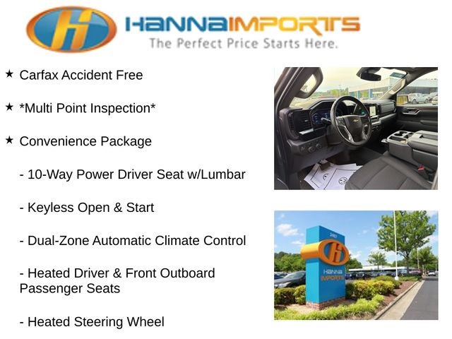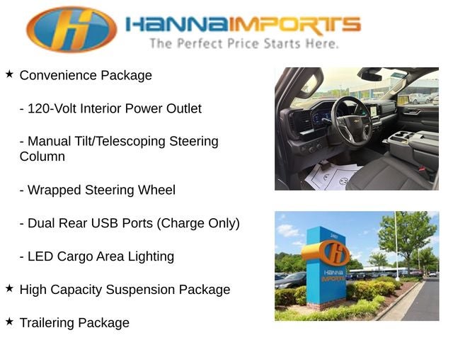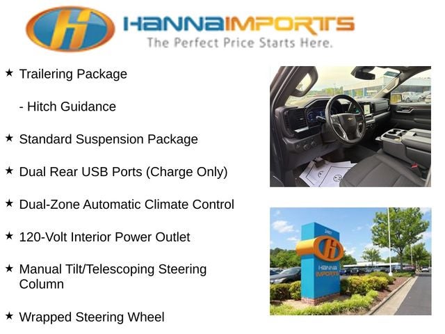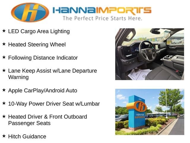 Why shop with Hanna Imports? We specialize in hand-selecting top-quality used cars, trucks, and SUVs for drivers across Raleigh, Durham, Cary, Chapel Hill, and the greater Triangle area of North Carolina. Our massive selection of 1,000+ vehicles on our Raleigh lot is carefully curated to include the most sought-after models, all priced below market value. We believe in transparency and efficiency—our vehicles are aggressively priced from the start, which means no haggling, no hassle, and no wasted time. The price you see is our absolute best price. Whether you're coming from Wake Forest, Apex, Garner, or anywhere in central NC, we’re committed to making your car-buying experience smooth, affordable, and enjoyable. Come see why Hanna Imports is one of the most trusted used car dealerships in North Carolina! Used Chevrolet Silverado 1500 in Raleigh. Used Chevrolet Silverado 1500 in North Carolina, Convenience Package (10-Way Power Driver Seat w/Lumbar, 120-Volt Interior Power Outlet, Dual Rear USB Ports (Charge Only), Dual-Zone Automatic Climate Control, Heated Driver & Front Outboard Passenger Seats, Heated Steering Wheel, Keyless Open & Start, LED Cargo Area Lighting, Manual Tilt/Telescoping Steering Column, Wrapped Steering Wheel, and 120-Volt Bed Mounted Power Outlet), High Capacity Suspension Package, Standard Suspension Package, Trailering Package (Hitch Guidance), Silverado 1500 LT, 8-Speed Automatic, 4WD, Black Cloth, Apple CarPlay/Android Auto, Following Distance Indicator, Lane Keep Assist w/Lane Departure Warning, 12.3 Multicolor Reconfigurable Digital Display, 3.42 Rear Axle Ratio, 4-Wheel Disc Brakes, 40/20/40 Front Split-Bench Seat, 6 Speakers, 6-Speaker Audio System, ABS brakes, Air Conditioning, All-Star Edition, Alloy wheels, AM/FM radio: SiriusXM with 360L, Auto High-beam Headlights, Auto-Locking Rear Differential, Automatic Emergency Braking, Automatic temperature control, Bluetooth® For Phone, Brake assist, Bumpers: chrome, Chrome Mirror Caps, Cloth Seat Trim, Color-Keyed Carpeting Floor Covering, Compass, Deep-Tinted Glass, Delay-off headlights, Driver door bin, Driver vanity mirror, Dual front impact airbags, Dual front side impact airbags, Electric Rear-Window Defogger, Electronic Cruise Control, Electronic Stability Control, Emergency communication system: OnStar, Forward Collision Alert, Front anti-roll bar, Front Center Armrest w/Storage, Front dual zone A/C, Front Frame-Mounted Black Recovery Hooks, Front Pedestrian Braking, Front reading lights, Front wheel independent suspension, Fully automatic headlights, HD Rear Vision Camera, Heated door mirrors, Heated front seats, Heated steering wheel, Illuminated entry, Integrated Trailer Brake Controller, IntelliBeam Automatic High Beam On/Off, Low tire pressure warning, Occupant sensing airbag, OnStar Services Capable, Outside temperature display, Overhead airbag, Overhead console, Panic alarm, Passenger door bin, Passenger vanity mirror, Power door mirrors, Power driver seat, Power Front Windows w/Driver Express Up/Down, Power Front Windows w/Passenger Express Down, Power Rear Windows w/Express Down, Power steering, Power windows, Premium audio system: Chevrolet Infotainment 3 Premium, Radio data system, Radio: Chevrolet Infotainment 3 Premium System, Rear 60/4