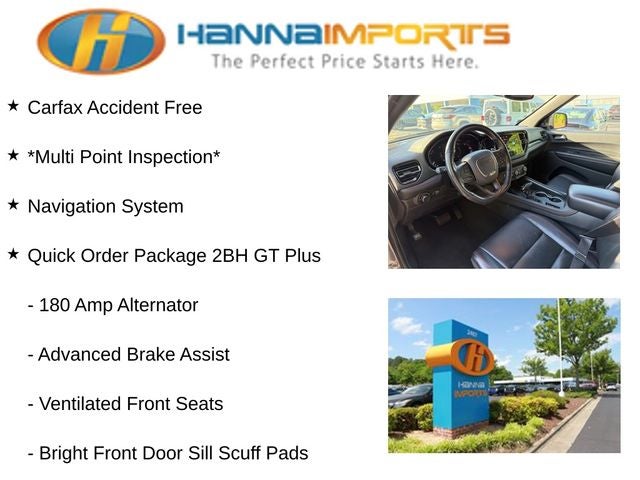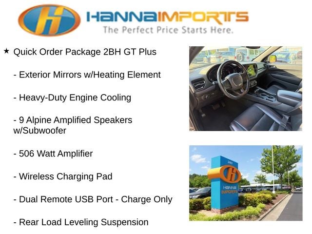 Why shop with Hanna Imports? We specialize in hand-selecting top-quality used cars, trucks, and SUVs for drivers across Raleigh, Durham, Cary, Chapel Hill, and the greater Triangle area of North Carolina. Our massive selection of 1,000+ vehicles on our Raleigh lot is carefully curated to include the most sought-after models, all priced below market value. We believe in transparency and efficiency—our vehicles are aggressively priced from the start, which means no haggling, no hassle, and no wasted time. The price you see is our absolute best price. Whether you're coming from Wake Forest, Apex, Garner, or anywhere in central NC, we’re committed to making your car-buying experience smooth, affordable, and enjoyable. Come see why Hanna Imports is one of the most trusted used car dealerships in North Carolina! Used Dodge Durango in Raleigh. Used Dodge Durango in North Carolina, Quick Order Package 2BH GT Plus (115V Auxiliary Power Outlet, 180 Amp Alternator, 506 Watt Amplifier, 7 & 4 Pin Wiring Harness, 9 Alpine Amplified Speakers w/Subwoofer, Adaptive Cruise Control w/Stop, Advanced Brake Assist, Auto High Beam Headlamp Control, Auto-Dimming Exterior Driver Mirror, Black Roof Rails, Blind Spot w/Trailer Detection, Bright Cargo Area Scuff Pads, Bright Front Door Sill Scuff Pads, Class IV Receiver Hitch, Dual Remote USB Port - Charge Only, Exterior Mirrors w/Heating Element, Exterior Mirrors w/Memory, Exterior Mirrors w/Supplemental Signals, Full Speed Forward Collision Warning Plus, Gloss Black Exterior Mirrors, Heated Second Row Seats, Heavy-Duty Engine Cooling, Integrated Roof Rail Crossbars, Lane Departure Warning Plus, Leather Trimmed Bucket Seats, Leather Wrapped Door Panels, LED Auxiliary Low Beam & Turn Signal, ParkSense Front/Rear Park Assist w/Stop, Power 6x9 Multi-Function Foldaway Mirrors, Power Driver/Passenger 4-Way Lumbar Adjust, Power Sunroof, Power Tilt & Telescopic Steering Column, Radio/Driver Seat/Mirrors Memory, Rain Sensitive Windshield Wipers, Rear Load Leveling Suspension, Red Accent Stitching, Security Alarm, Sun Visors w/Illuminated Vanity Mirrors, Trailer Brake Control, Ventilated Front Seats, and Wireless Charging Pad), Durango GT Plus, AWD, Navigation System, ParkView Rear Back-Up Camera, Power Liftgate, 3.45 Rear Axle Ratio, 3rd row seats: split-bench, 4-Wheel Disc Brakes, 6 Speakers, ABS brakes, Air Conditioning, Alloy wheels, AM/FM radio: SiriusXM w/360L, Apple CarPlay/Android Auto, Auto-dimming Rear-View