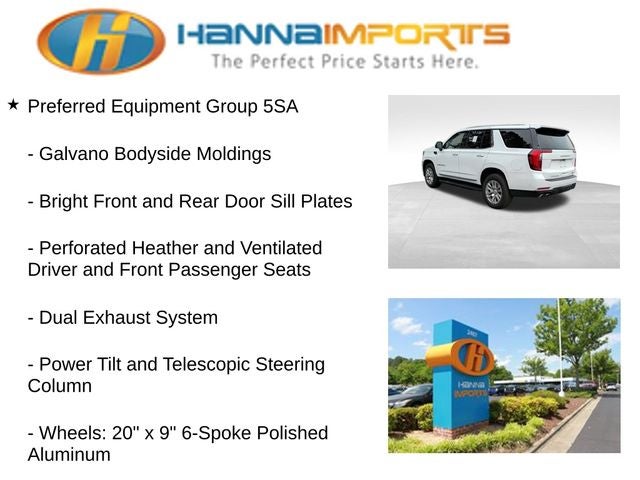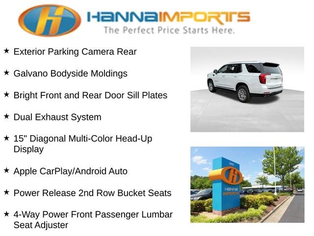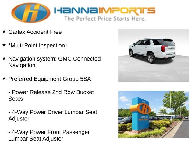 Why shop with Hanna Imports? We specialize in hand-selecting top-quality used cars, trucks, and SUVs for drivers across Raleigh, Durham, Cary, Chapel Hill, and the greater Triangle area of North Carolina. Our massive selection of 1,000+ vehicles on our Raleigh lot is carefully curated to include the most sought-after models, all priced below market value. We believe in transparency and efficiency—our vehicles are aggressively priced from the start, which means no haggling, no hassle, and no wasted time. The price you see is our absolute best price. Whether you're coming from Wake Forest, Apex, Garner, or anywhere in central NC, we’re committed to making your car-buying experience smooth, affordable, and enjoyable. Come see why Hanna Imports is one of the most trusted used car dealerships in North Carolina! Used GMC Yukon in Raleigh. Used GMC Yukon in North Carolina, Preferred Equipment Group 5SA (15 Diagonal Multi-Color Head-Up Display, 4-Way Power Driver Lumbar Seat Adjuster, 4-Way Power Front Passenger Lumbar Seat Adjuster, AutoSense Hands-Free Power Liftgate, Bright Front and Rear Door Sill Plates, Dual Exhaust System, Galvano Bodyside Moldings, Magnetic Ride Control Suspension, Perforated Heather and Ventilated Driver and Front Passenger Seats, Power Release 2nd Row Bucket Seats, Power Tilt and Telescopic Steering Column, and Wheels: 20 x 9 6-Spoke Polished Aluminum), License Plate Front Mounting Package, Yukon Denali, 4WD, Summit White, Apple CarPlay/Android Auto, Exterior Parking Camera Rear, Navigation system: GMC Connected Navigation, Power Liftgate, 10 Speakers, 3.23 Rear Axle Ratio, 3rd row seats: split-bench, 4-Wheel Disc Brakes, ABS brakes, Adaptive suspension, Air Conditioning, Alloy wheels, AM/FM radio: SiriusXM with 360L, Audio memory, Auto High-beam Headlights, Auto-dimming door mirrors, Auto-dimming Rear-View mirror, Auto-leveling suspension, Automatic temperature control, Bodyside moldings, Bose 10-Speaker Surround with CenterPoint, Brake assist, Bumpers: body-color, Compass, Delay-off headlights, Deleted OnStar Basics, Driver door bin, Driver vanity mirror, Dual front impact airbags, Dual front side impact airbags, Electronic Stability Control, Emergency communication system: OnStar and GMC connected services capable, Four wheel independent suspension, Front anti-roll bar, Front Bucket Seats, Front Center Armrest, Front dual zone A/C, Front fog lights, Front reading lights, Fully automatic headlights, Garage door transmitter, Heads-Up Display, Heated door mirrors, Heated Driver and Front Passenger Seats, Heated front seats, Heated rear seats, Heated steering wheel, Illuminated entry, Low tire pressure warning, Memory seat, Occupant sensing airbag, Outside temperature display, Overhead airbag, Overhead console, Panic alarm, Passenger door bin, Passenger vanity mirror, Perforated Leather Seating Surfaces, Power door mirrors, Power driver seat, Power passenger seat, Power steering, Power windows, Radio: 16.8 Diagonal Premium GMC Infotainment System, Rain sensing wipers, Rear air conditioning, Rear anti-roll bar, Rear reading lights, Rear window defroster, Rear window wiper, Remote keyless entry, Security system, SiriusXM with