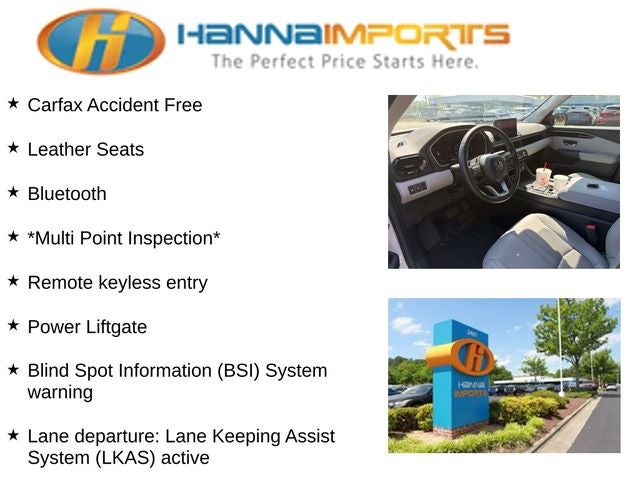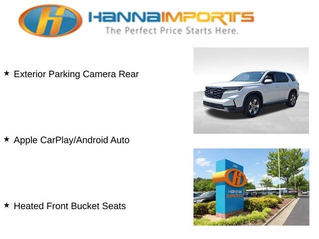 Why shop with Hanna Imports? We specialize in hand-selecting top-quality used cars, trucks, and SUVs for drivers across Raleigh, Durham, Cary, Chapel Hill, and the greater Triangle area of North Carolina. Our massive selection of 1,000+ vehicles on our Raleigh lot is carefully curated to include the most sought-after models, all priced below market value. We believe in transparency and efficiency—our vehicles are aggressively priced from the start, which means no haggling, no hassle, and no wasted time. The price you see is our absolute best price. Whether you're coming from Wake Forest, Apex, Garner, or anywhere in central NC, we’re committed to making your car-buying experience smooth, affordable, and enjoyable. Come see why Hanna Imports is one of the most trusted used car dealerships in North Carolina! Used Honda Pilot in Raleigh. Used Honda Pilot in North Carolina, Pilot EX-L, Platinum White Pearl, Apple CarPlay/Android Auto, Blind Spot Information (BSI) System warning, Exterior Parking Camera Rear, Heated Front Bucket Seats, Lane departure: Lane Keeping Assist System (LKAS) active, Power Liftgate, Remote keyless entry, 3rd row seats: split-bench, 4-Wheel Disc Brakes, 4.167 Axle Ratio, 9 Speakers, ABS brakes, Adaptive Cruise Control: Adaptive Cruise Control (ACC) with Low-Speed Follow, Air Conditioning, Alloy wheels, AM/FM radio: SiriusXM, Auto High-beam Headlights, Auto-dimming Rear-View mirror, Automatic temperature control, Brake assist, Bumpers: body-color, Delay-off headlights, Driver door bin, Driver vanity mirror, Dual front impact airbags, Dual front side impact airbags, Electronic Stability Control, Emergency communication system: HondaLink Assist, Four wheel independent suspension, Front anti-roll bar, Front Bucket Seats, Front Center Armrest, Front dual zone A/C, Front fog lights, Front reading lights, Fully automatic headlights, Garage door transmitter: HomeLink, Heated door mirrors, Heated front seats, Illuminated entry, Knee airbag, Leather Seat Trim, Low tire pressure warning, Memory seat, Occupant sensing airbag, Outside temperature display, Overhead airbag, Overhead console, Panic alarm, Passenger door bin, Passenger vanity mirror, Power door mirrors, Power driver seat, Power passenger seat, Power steering, Power windows, Radio data system, Radio: 245-Watt Audio System, Rear air conditioning, Rear anti-roll bar, Rear reading lights, Rear seat center armrest, Rear window defroster, Rear window wiper, Reclining 3rd row seat, Security system, SiriusXM, Speed control, Speed-sensing steering, Speed-Sensitive Wipers, Split folding rear seat, Spoiler, Steering wheel mounted audio controls, Tachometer, Telescoping steering wheel, Tilt steering wheel, Traction control, Trip computer, Turn signal indicator mirrors, Variably intermittent wipers, and Wheels: 18 Pewter Gray Machined Face.