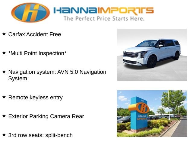 Why shop with Hanna Imports? We specialize in hand-selecting top-quality used cars, trucks, and SUVs for drivers across Raleigh, Durham, Cary, Chapel Hill, and the greater Triangle area of North Carolina. Our massive selection of 1,000+ vehicles on our Raleigh lot is carefully curated to include the most sought-after models, all priced below market value. We believe in transparency and efficiency—our vehicles are aggressively priced from the start, which means no haggling, no hassle, and no wasted time. The price you see is our absolute best price. Whether you're coming from Wake Forest, Apex, Garner, or anywhere in central NC, we’re committed to making your car-buying experience smooth, affordable, and enjoyable. Come see why Hanna Imports is one of the most trusted used car dealerships in North Carolina! Used Kia Carnival in Raleigh. Used Kia Carnival in North Carolina, Carnival LXS, 3rd row seats: split-bench, Exterior Parking Camera Rear, Navigation system: AVN 5.0 Navigation System, Remote keyless entry, 3.51 Axle Ratio, 4-Wheel Disc Brakes, 6 Speakers, 6.5J x 17 Alloy Wheels, ABS brakes, Air Conditioning, Alloy wheels, AM/FM radio: SiriusXM, Apple CarPlay & Android Auto, Auto High-beam Headlights, Automatic temperature control, Brake assist, Bumpers: body-color, Compass, Delay-off headlights, Driver door bin, Driver vanity mirror, Dual front impact airbags, Dual front side impact airbags, Electronic Stability Control, Emergency communication system, Four wheel independent suspension, Front anti-roll bar, Front Bucket Seats, Front Center Armrest, Front dual zone A/C, Front reading lights, Fully automatic headlights, Heated door mirrors, Illuminated entry, Knee airbag, Low tire pressure warning, Occupant sensing airbag, Outside temperature display, Overhead airbag, Overhead console, Panic alarm, Passenger door bin, Passenger vanity mirror, Power door mirrors, Power steering, Power windows, Radio: AM/FM/HD Audio System, Rear air conditioning, Rear anti-roll bar, Rear reading lights, Rear window defroster, Rear window wiper, Reclining 3rd row seat, Security system, Speed control, Speed-sensing steering, Split folding rear seat, Spoiler, Steering wheel mounted audio controls, Tachometer, Telescoping steering wheel, Tilt steering wheel, Traction control, Trailer Prewire Harness, Trip computer, Turn signal indicator mirrors, and Variably intermittent wipers.