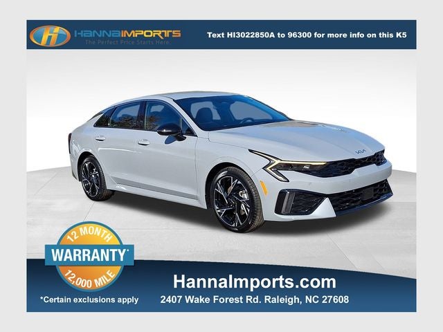 Why shop with Hanna Imports? We specialize in hand-selecting top-quality used cars, trucks, and SUVs for drivers across Raleigh, Durham, Cary, Chapel Hill, and the greater Triangle area of North Carolina. Our massive selection of 1,000+ vehicles on our Raleigh lot is carefully curated to include the most sought-after models, all priced below market value. We believe in transparency and efficiency—our vehicles are aggressively priced from the start, which means no haggling, no hassle, and no wasted time. The price you see is our absolute best price. Whether you're coming from Wake Forest, Apex, Garner, or anywhere in central NC, we’re committed to making your car-buying experience smooth, affordable, and enjoyable. Come see why Hanna Imports is one of the most trusted used car dealerships in North Carolina! Used Kia K5 in Raleigh. Used Kia K5 in North Carolina, K5 GT-Line, Heated Front Bucket Seats, Navigation System, Remote keyless entry, 4-Wheel Disc Brakes, 6 Speakers, ABS brakes, Air Conditioning, Alloy wheels, AM/FM radio: SiriusXM, Auto High-beam Headlights, Automatic temperature control, Brake assist, Bumpers: body-color, Carpeted Floor Mats, Delay-off headlights, Driver door bin, Driver vanity mirror, Dual front impact airbags, Dual front side impact airbags, Electronic Stability Control, Emergency communication system: Kia Connect (includes 1 year free trial), Four wheel independent suspension, Front anti-roll bar, Front Bucket Seats, Front Center Armrest, Front dual zone A/C, Front fog lights, Front reading lights, Fully automatic headlights, Heated door mirrors, Heated front seats, Heated steering wheel, Illuminated entry, Knee airbag, Leather Shift Knob, Leather steering wheel, Low tire pressure warning, Occupant sensing airbag, Outside temperature display, Overhead airbag, Overhead console, Panic alarm, Passenger door bin, Passenger vanity mirror, Power door mirrors, Power driver seat, Power steering, Power windows, Radio data system, Radio: AM/FM Audio System, Rear anti-roll bar, Rear seat center armrest, Rear side impact airbag, Rear window defroster, Security system, Speed control, Speed-sensing steering, Split folding rear seat, Sport steering wheel, Steering wheel mounted audio controls, Tachometer, Telescoping steering wheel, Tilt steering wheel, Traction control, Trip computer, Turn signal indicator mirrors, Variably intermittent wipers, and Wheels: 18 x 7.5J Gloss Black Machined Finish Alloy.