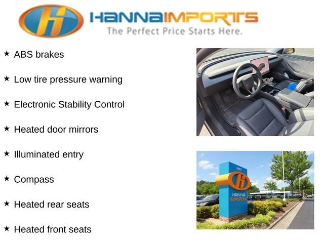 Why shop with Hanna Imports? We specialize in hand-selecting top-quality used cars, trucks, and SUVs for drivers across Raleigh, Durham, Cary, Chapel Hill, and the greater Triangle area of North Carolina. Our massive selection of 1,000+ vehicles on our Raleigh lot is carefully curated to include the most sought-after models, all priced below market value. We believe in transparency and efficiency—our vehicles are aggressively priced from the start, which means no haggling, no hassle, and no wasted time. The price you see is our absolute best price. Whether you're coming from Wake Forest, Apex, Garner, or anywhere in central NC, we’re committed to making your car-buying experience smooth, affordable, and enjoyable. Come see why Hanna Imports is one of the most trusted used car dealerships in North Carolina! Used Tesla Model 3 in Raleigh. Used Tesla Model 3 in North Carolina, Model 3 Long Range, ABS brakes, Alloy wheels, Compass, Electronic Stability Control, Emergency communication system, Front dual zone A/C, Heated door mirrors, Heated front seats, Heated rear seats, Illuminated entry, Low tire pressure warning, Navigation System, Traction control, 4-Wheel Disc Brakes, 9 Speakers, Air Conditioning, Audio memory, Auto High-beam Headlights, Auto-dimming door mirrors, Auto-dimming Rear-View mirror, Automatic temperature control, Brake assist, Bumpers: body-color, Delay-off headlights, Driver door bin, Driver vanity mirror, Dual front impact airbags, Dual front side impact airbags, Exterior Parking Camera Rear, Four wheel independent suspension, Front anti-roll bar, Front Bucket Seats, Front Center Armrest w/Storage, Front reading lights, Fully automatic headlights, Heated and Ventilated Front Seats, Heated steering wheel, HVAC memory, Knee airbag, Lane Departure Warning System, Memory seat, Occupant sensing airbag, Outside temperature display, Overhead airbag, Passenger door bin, Passenger vanity mirror, Power door mirrors, Power driver seat, Power passenger seat, Power steering, Power windows, Radio data system, Radio: Base Audio System, Rain sensing wipers, Rear air conditioning, Rear audio controls, Rear reading lights, Rear seat center armrest, Rear window defroster, Security system, Speed control, Speed-sensing steering, Split folding rear seat, Steering wheel memory, Steering wheel mounted A/C controls, Steering wheel mounted audio controls, Telescoping steering wheel, Tilt steering wheel, Trip computer, Variably intermittent wipers, Vegan Leather Seat Trim, Ventilated front seats, and Wheels: 18 x 8.5 Photon.
