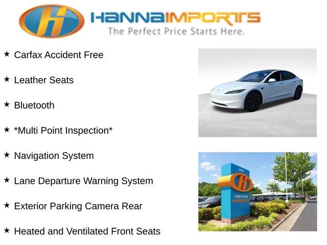 Why shop with Hanna Imports? We specialize in hand-selecting top-quality used cars, trucks, and SUVs for drivers across Raleigh, Durham, Cary, Chapel Hill, and the greater Triangle area of North Carolina. Our massive selection of 1,000+ vehicles on our Raleigh lot is carefully curated to include the most sought-after models, all priced below market value. We believe in transparency and efficiency—our vehicles are aggressively priced from the start, which means no haggling, no hassle, and no wasted time. The price you see is our absolute best price. Whether you're coming from Wake Forest, Apex, Garner, or anywhere in central NC, we’re committed to making your car-buying experience smooth, affordable, and enjoyable. Come see why Hanna Imports is one of the most trusted used car dealerships in North Carolina! Used Tesla Model 3 in Raleigh. Used Tesla Model 3 in North Carolina, Model 3 Long Range, Exterior Parking Camera Rear, Heated and Ventilated Front Seats, Heated steering wheel, Lane Departure Warning System, Navigation System, 4-Wheel Disc Brakes, 9 Speakers, ABS brakes, Air Conditioning, Alloy wheels, Audio memory, Auto High-beam Headlights, Auto-dimming door mirrors, Auto-dimming Rear-View mirror, Automatic temperature control, Brake assist, Bumpers: body-color, Compass, Delay-off headlights, Driver door bin, Driver vanity mirror, Dual front impact airbags, Dual front side impact airbags, Electronic Stability Control, Emergency communication system, Four wheel independent suspension, Front anti-roll bar, Front Bucket Seats, Front Center Armrest w/Storage, Front dual zone A/C, Front reading lights, Fully automatic headlights, Heated door mirrors, Heated front seats, Heated rear seats, HVAC memory, Illuminated entry, Knee airbag, Low tire pressure warning, Memory seat, Occupant sensing airbag, Outside temperature display, Overhead airbag, Passenger door bin, Passenger vanity mirror, Power door mirrors, Power driver seat, Power passenger seat, Power steering, Power windows, Radio data system, Radio: Base Audio System, Rain sensing wipers, Rear air conditioning, Rear audio controls, Rear reading lights, Rear seat center armrest, Rear window defroster, Security system, Speed control, Speed-sensing steering, Split folding rear seat, Steering wheel memory, Steering wheel mounted A/C controls, Steering wheel mounted audio controls, Telescoping steering wheel, Tilt steering wheel, Traction control, Trip computer, Variably intermittent wipers, Vegan Leather Seat Trim, Ventilated front seats, and Wheels: 18 x 8.5 Photon.