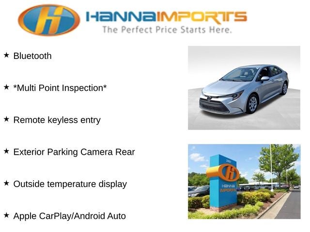Why shop with Hanna Imports? We specialize in hand-selecting top-quality used cars, trucks, and SUVs for drivers across Raleigh, Durham, Cary, Chapel Hill, and the greater Triangle area of North Carolina. Our massive selection of 1,000+ vehicles on our Raleigh lot is carefully curated to include the most sought-after models, all priced below market value. We believe in transparency and efficiency—our vehicles are aggressively priced from the start, which means no haggling, no hassle, and no wasted time. The price you see is our absolute best price. Whether you're coming from Wake Forest, Apex, Garner, or anywhere in central NC, we’re committed to making your car-buying experience smooth, affordable, and enjoyable. Come see why Hanna Imports is one of the most trusted used car dealerships in North Carolina! Used Toyota Corolla in Raleigh. Used Toyota Corolla in North Carolina, Corolla LE, Apple CarPlay/Android Auto, Exterior Parking Camera Rear, Outside temperature display, Remote keyless entry, 4-Wheel Disc Brakes, 6 Speakers, ABS brakes, Air Conditioning, AM/FM radio: SiriusXM, Auto High-beam Headlights, Automatic temperature control, Brake assist, Bumpers: body-color, Delay-off headlights, Driver door bin, Driver vanity mirror, Dual front impact airbags, Dual front side impact airbags, Electronic Stability Control, Emergency communication system: Safety Connect (up to 10-year trial subscription), Fabric Seat Trim, Front anti-roll bar, Front Bucket Seats, Front Center Armrest, Front reading lights, Front wheel independent suspension, Fully automatic headlights, Illuminated entry, Knee airbag, Low tire pressure warning, Occupant sensing airbag, Overhead airbag, Panic alarm, Passenger door bin, Passenger vanity mirror, Power door mirrors, Power steering, Power windows, Radio data system, Radio: 8 Toyota Audio Multimedia, Rear anti-roll bar, Rear seat center armrest, Rear side impact airbag, Rear window defroster, Speed control, Split folding rear seat, Steering wheel mounted audio controls, Tachometer, Telescoping steering wheel, Tilt steering wheel, Traction control, Trip computer, and Wheels: 16 Steel with Covers.